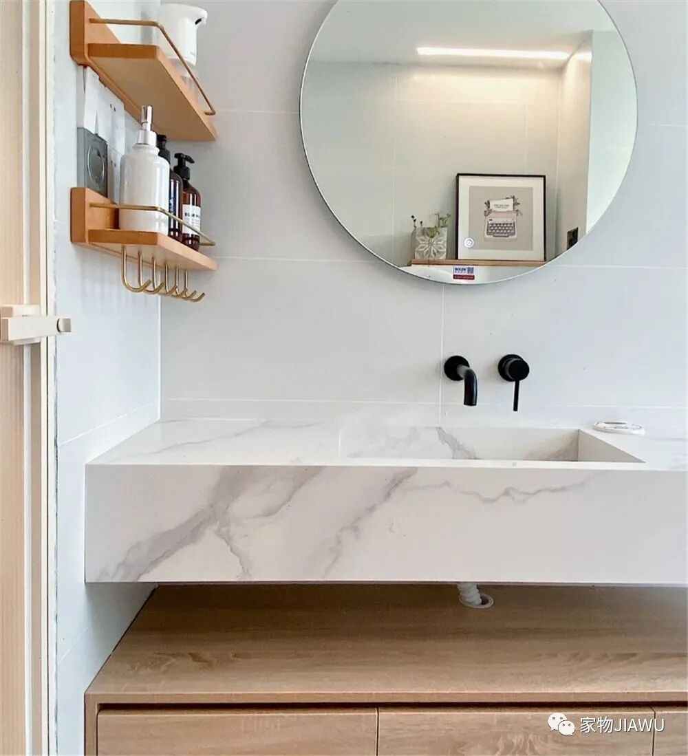而为了不影响视觉观感,姑娘特意在墙面增加了收纳隔板,方便放置一些洗漱用品,让台面保持“净空”状态。