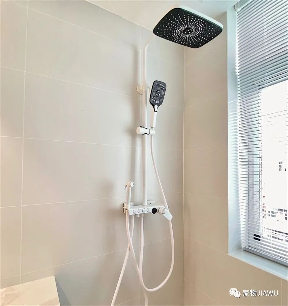 而靠洗手池的一侧,则安装了恒温花洒(个人感觉是智商税的小家电),底部用长条形的地漏提升排水效果,再加上这是一间旁边有窗户透气的明卫,好像也一定程度上中和了未做干湿分区的弊端。
