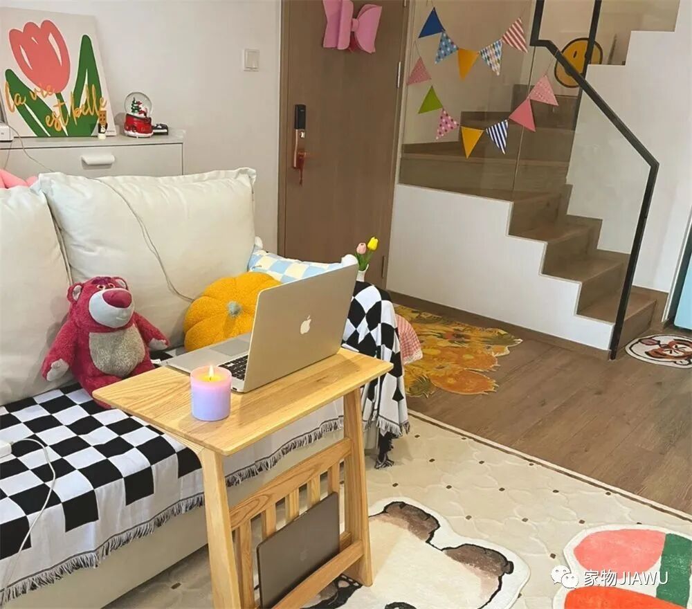 客厅的沙发周围,同样也是她居家办公的地方,搭配一张简易的笔记本桌,就可以窝在沙发上边喝茶、边工作了。