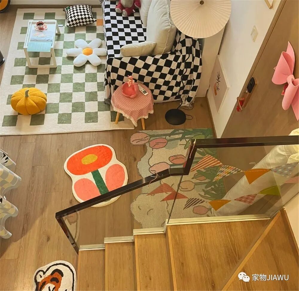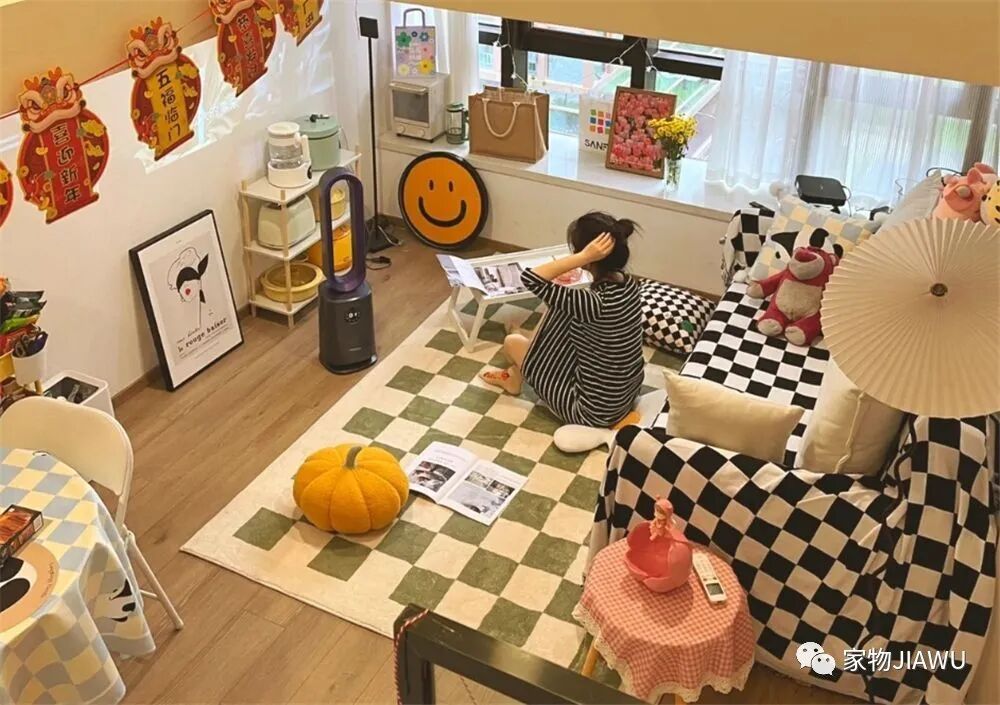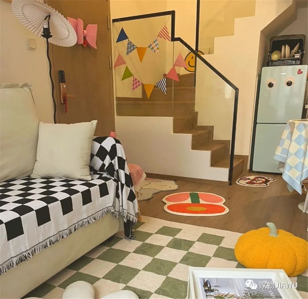 而客厅内的沙发、地毯,也用的是这种比较流行的棋盘格进行装饰,给狭小的空间带来了几分生动活泼的感觉,让人眼前一亮。