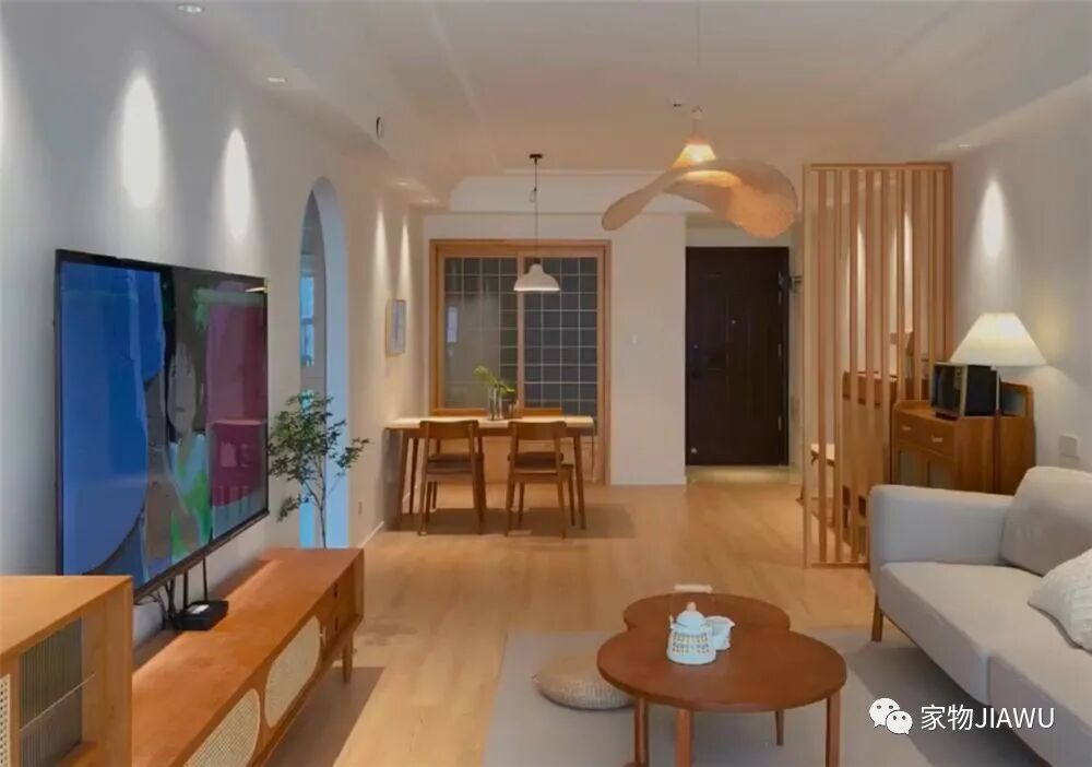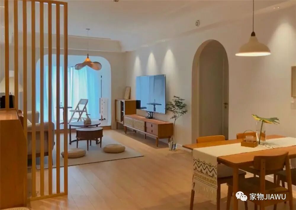 但在装修后,屋主增添了不少细节,比如用木格栅分隔客厅和餐厅空间、用简单的白墙代替原本相对复杂的电视墙等等,都提升了家中的高级感。
