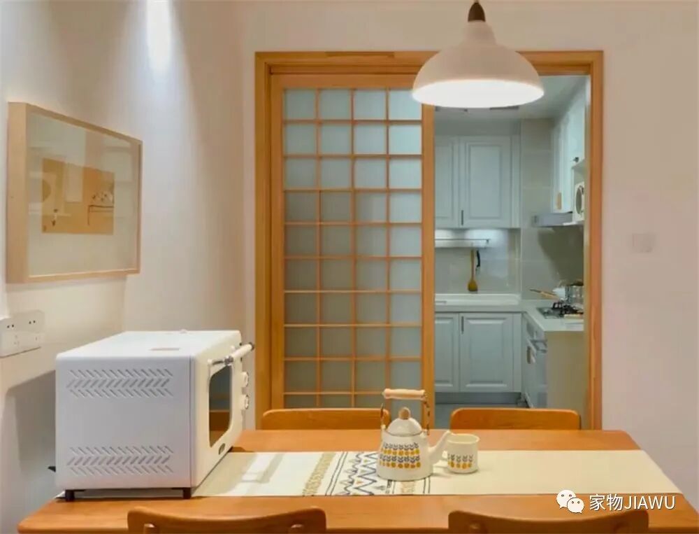 而经过翻新后,屋主借鉴了日式风的设计,用木格栅门更换原本的厨房门,并且为餐厅换上了更加轻盈的吊灯,再加上木地板和一些暖色的辅助照明灯,让家里显得倍感温馨。
