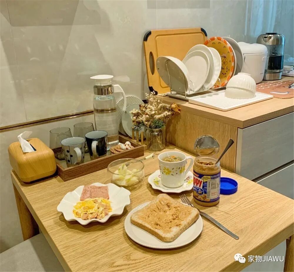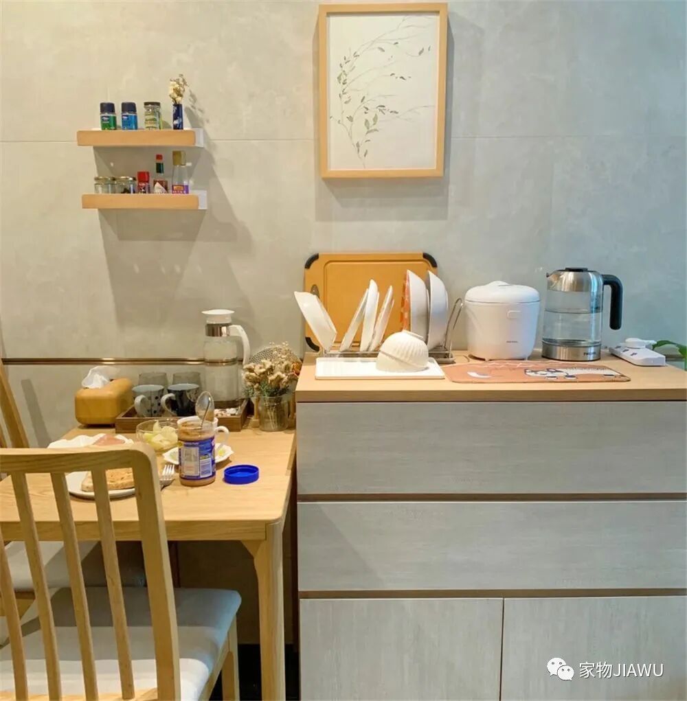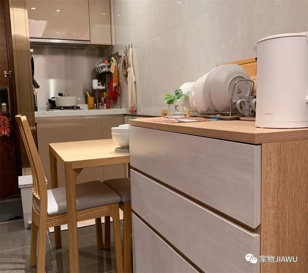 再往屋里走去,紧挨着厨房的餐桌靠墙摆放,最多可以坐下两个人,旁边的收纳柜顶部,完全当成了餐边柜使用,收纳水壶、电饭煲、碗碟餐具等物品。