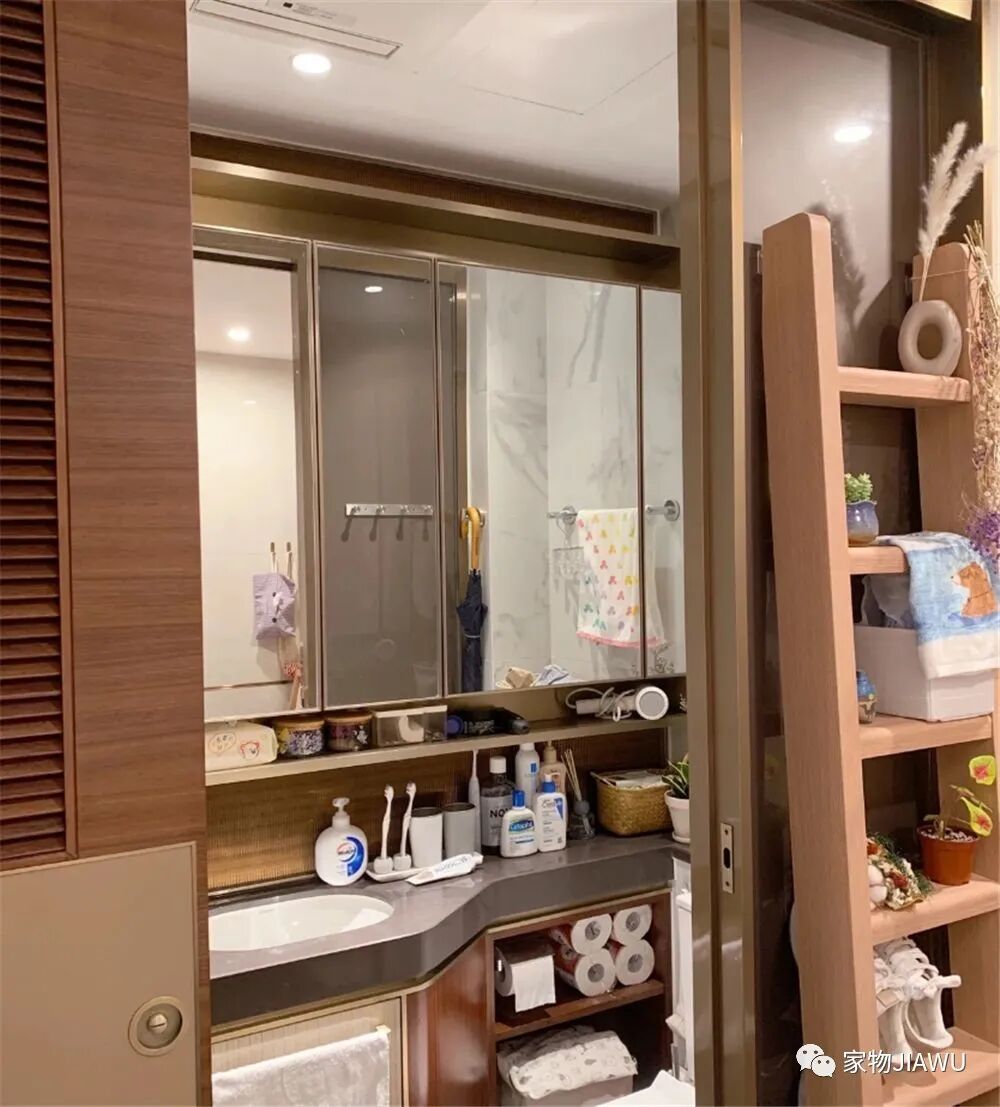 一进门右手边,是家里超小的卫生间和浴室,这里也是狭长式的格局设计,中间是洗手池、一侧是马桶,另一侧则是个小小的浴室,各种化妆和洗漱用品,都隐藏在了镜柜的隔层内。