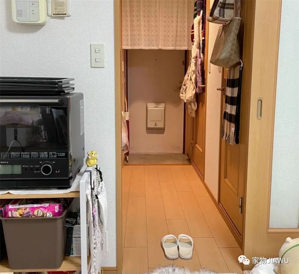 从卧室向外望去,目光转向进门的走廊,一眼就能望到入户门和玄关,而且可以发现狭窄的走廊空间真的很逼仄……