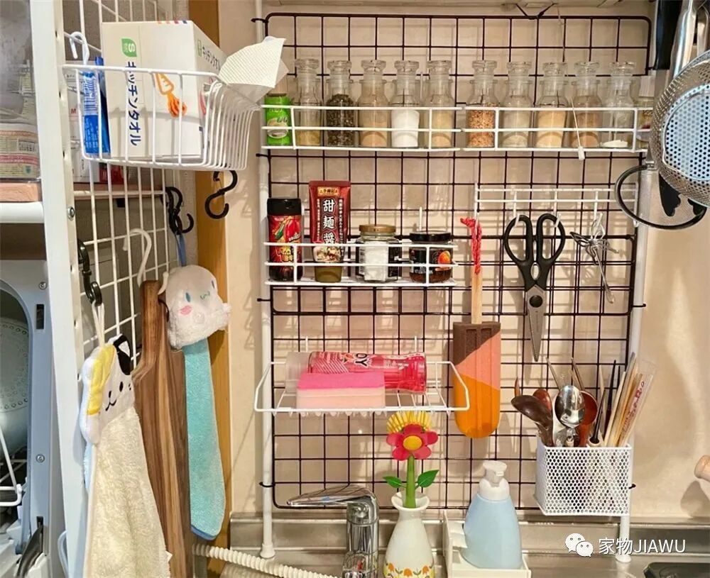 一些调味品、勺筷之类的餐具,也都挂置在了这组网格架上,平时用的时候可以随手拿取。