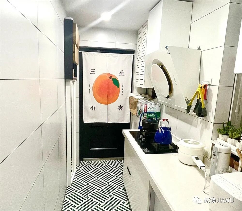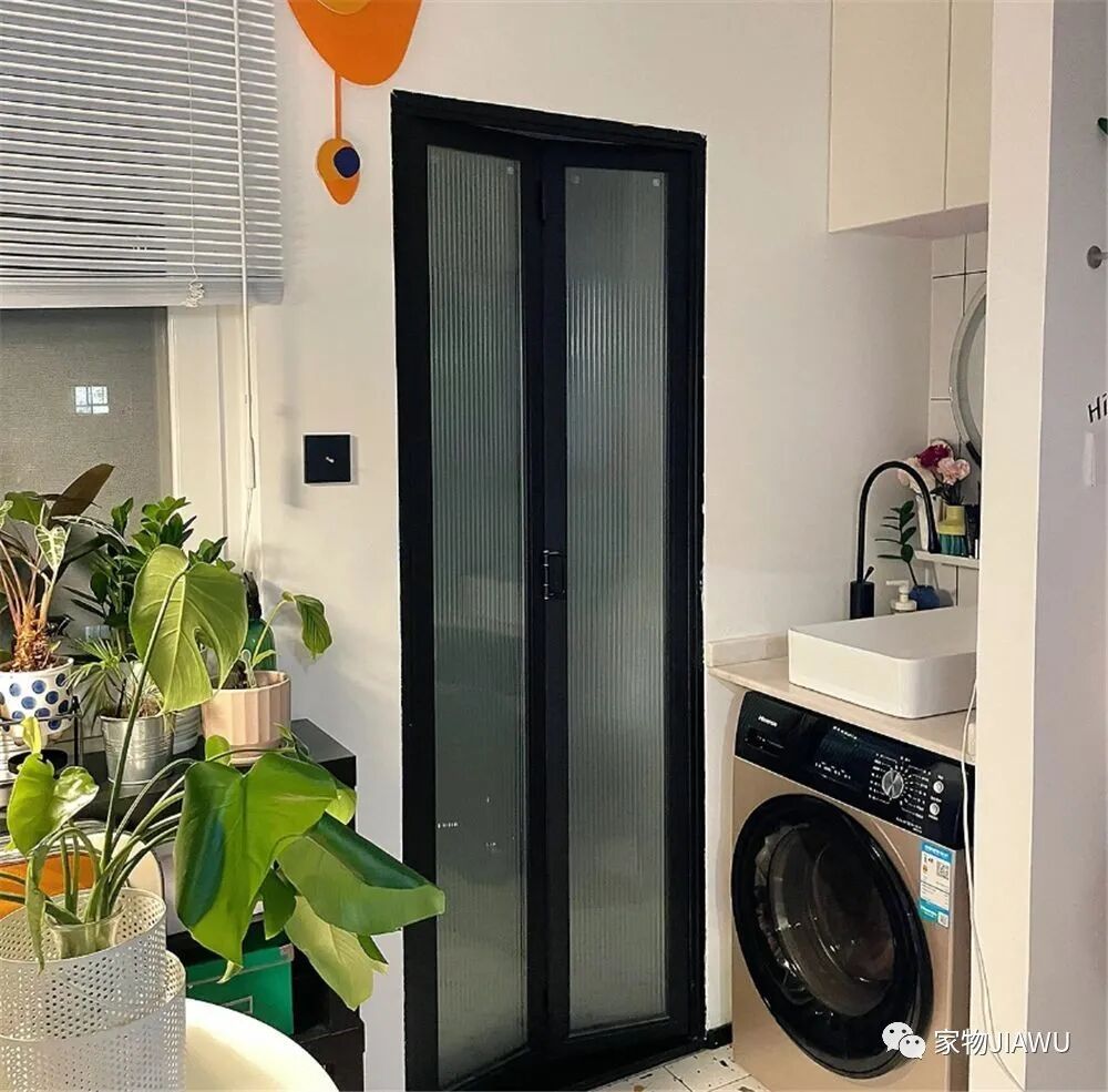 原本家里的客厅空间又分隔出一部分,通过新砌起的隔断墙,安装了洗手池并嵌入洗衣机,空间分配真的让人叫绝。