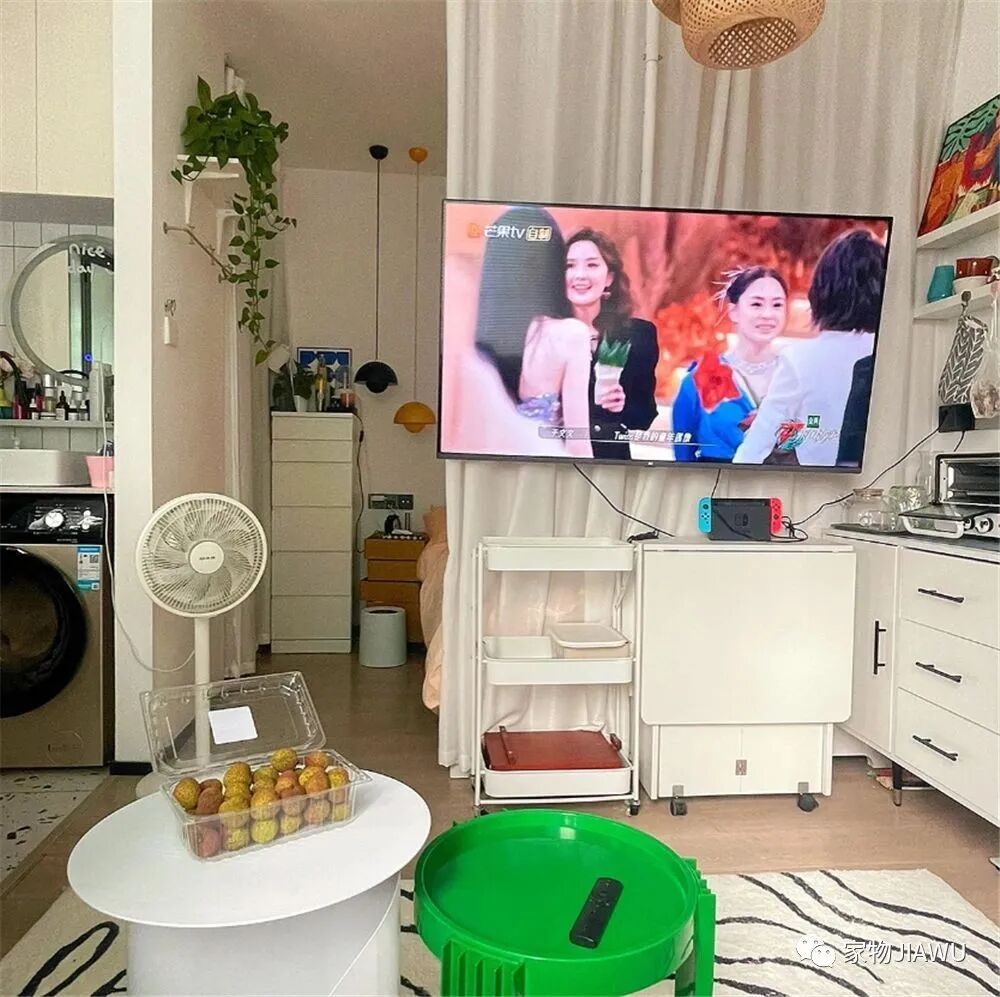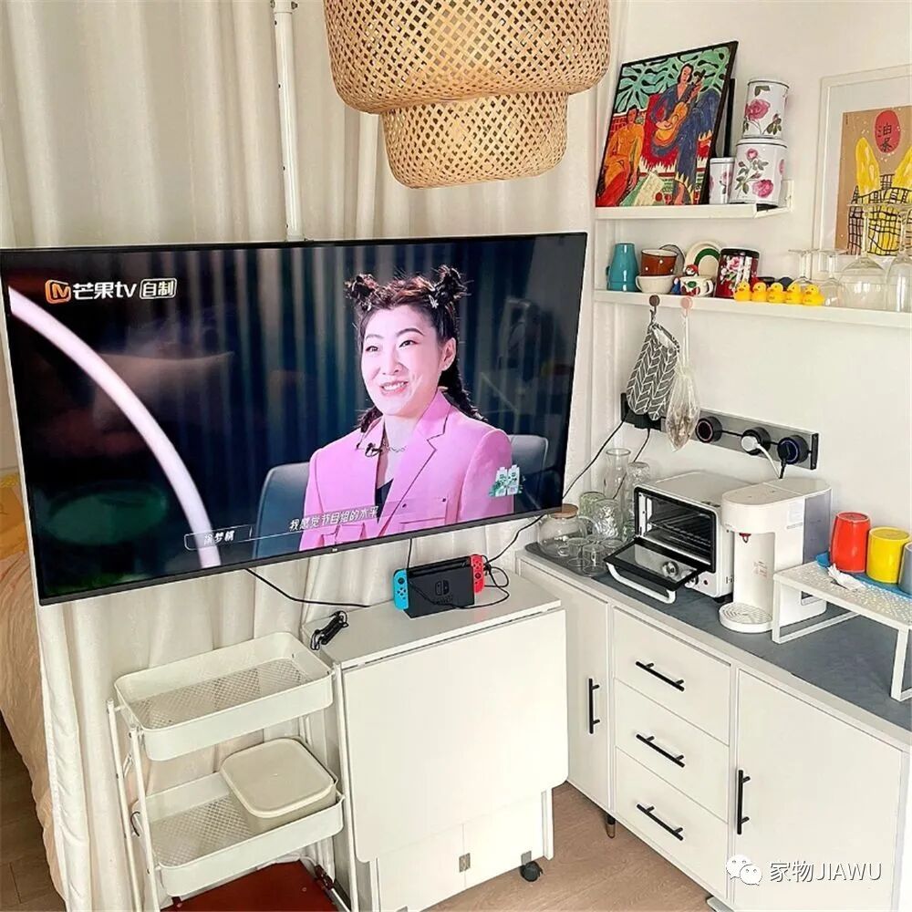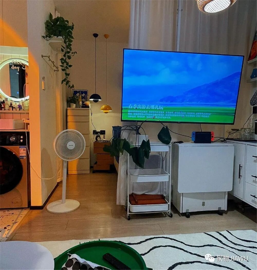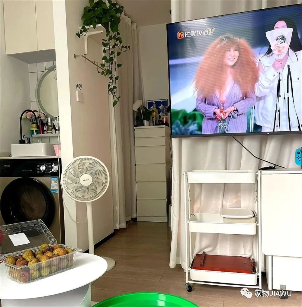 沙发的对面,是姑娘用窗帘隔断出的卧室,在窗帘前面摆放上小推车和折叠桌,就打造出了一个简单的电视墙。