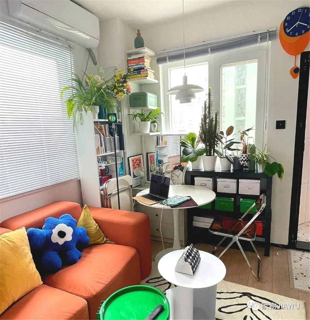 在客厅靠窗的角落,姑娘还设计出了一个小小的餐厅和办公区域,既可以在这里用餐吃饭,又可以在这里居家办公,周围的柜子起到收纳作用,植物起到装饰作用,将小空间完全利用起来。