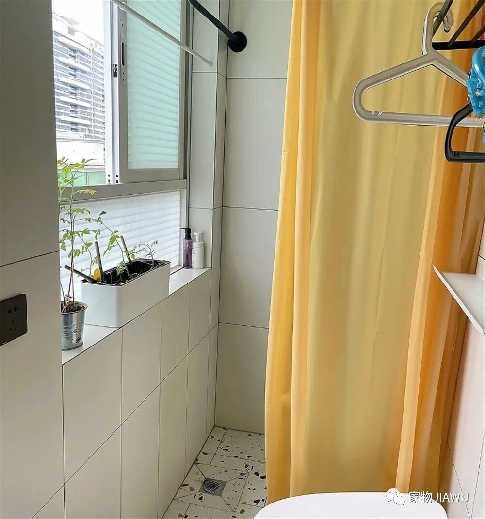 同样用浴帘进行“软隔断”,简单分隔出干湿区域,让卫生间的空间分配更加合理,同时也避免洗澡时溅得水到处都是,比之前的格局要实用许多。