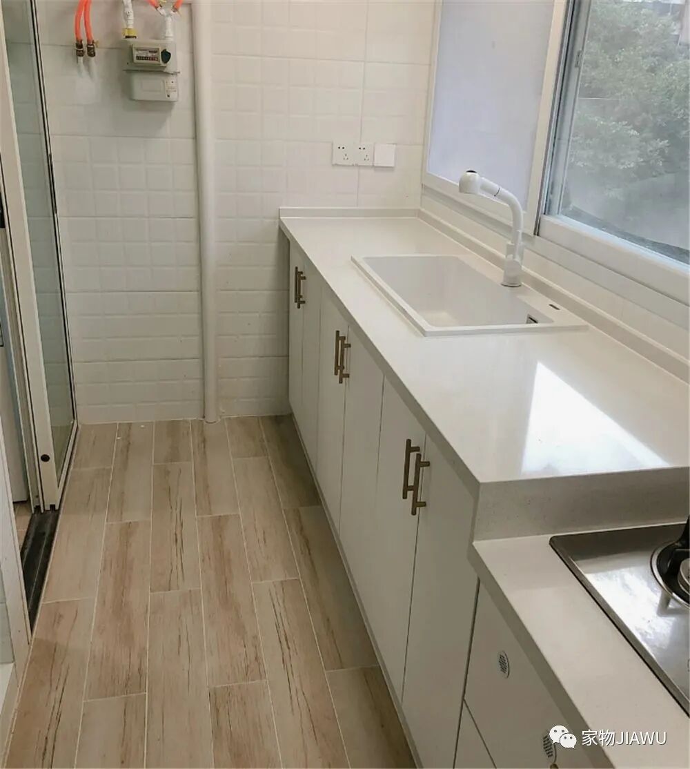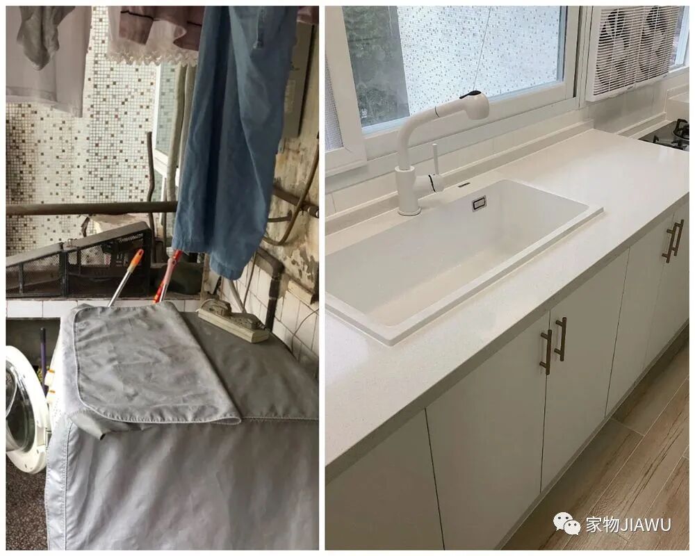 阳台在这次翻修改造的过程中,变化也是非常之大!之前的阳台连通厨房,被当做了一个洗衣房的区域,而现在,洗衣房的功能被挪到了厨房里,阳台,自然也改成了厨房。