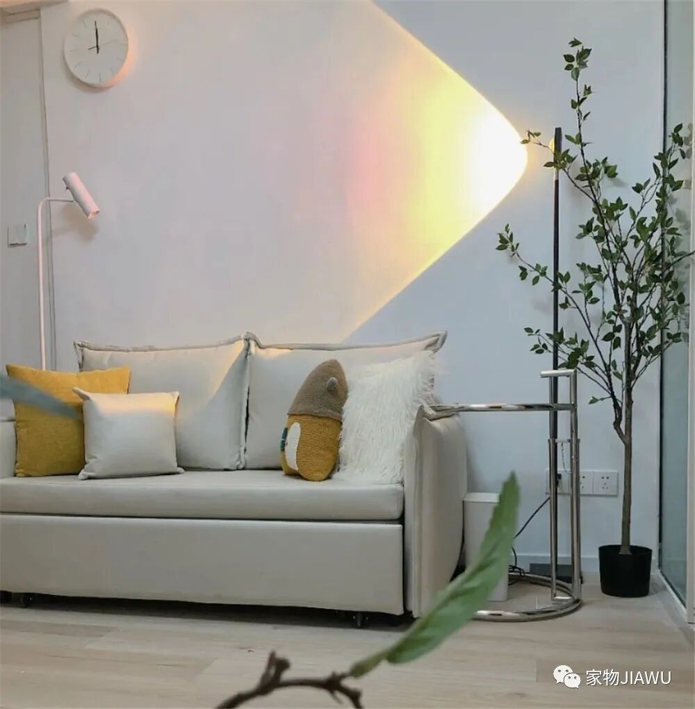 而在改造后,姑娘特意加入了更多的照明光源,并且把墙面漆成白色、地面也换上了浅色的木地板,干起来清新明快又干净,将走廊变成了一间小小的客厅。
