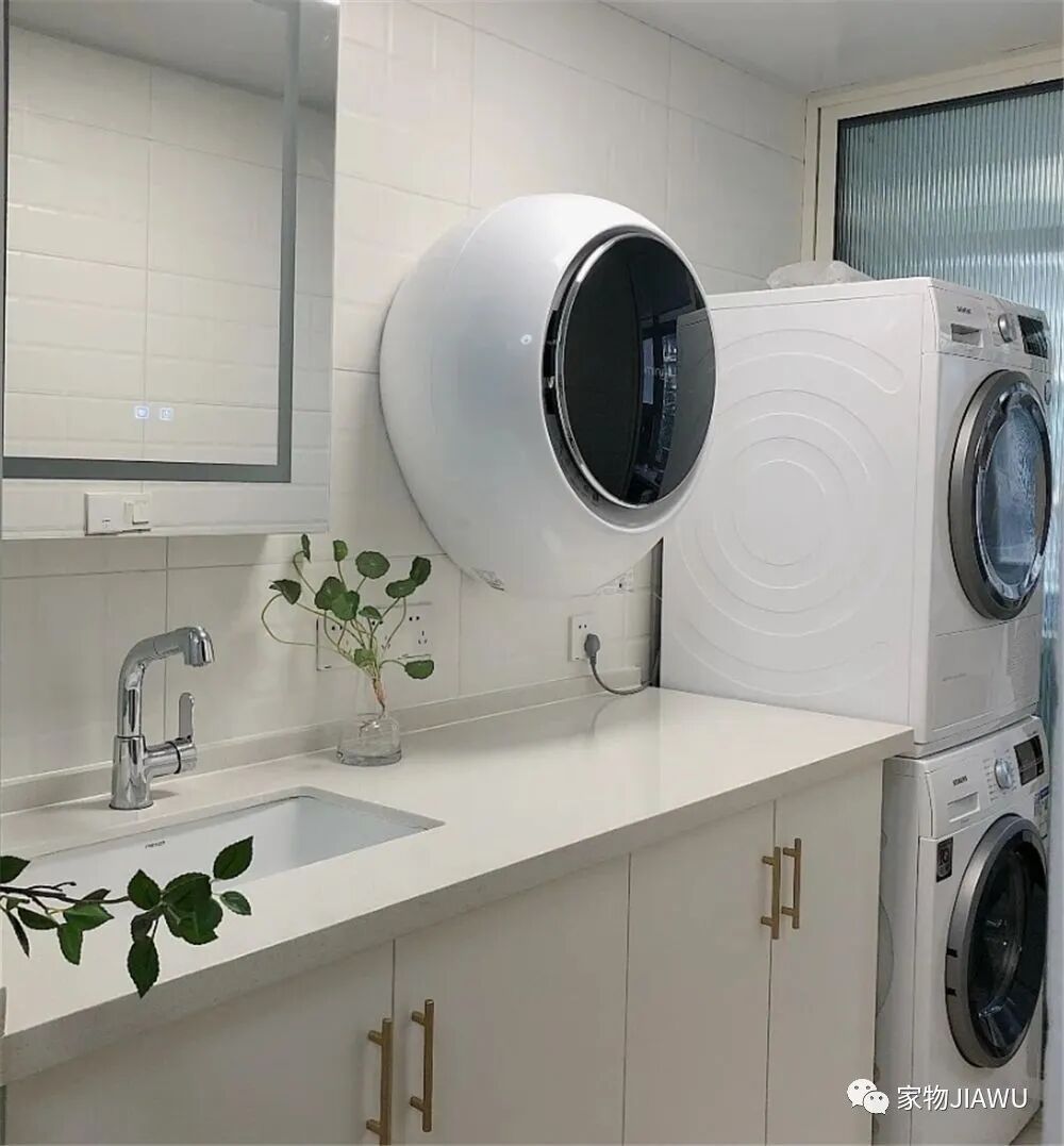 但在这次翻修改造过后,厨房直接变成了一个兼顾收纳功能的洗衣房,将这里重新还原出了过道原本的景象,即便安装上洗衣机、烘干机、壁挂洗衣机后,看起来也依旧是美观又简洁。