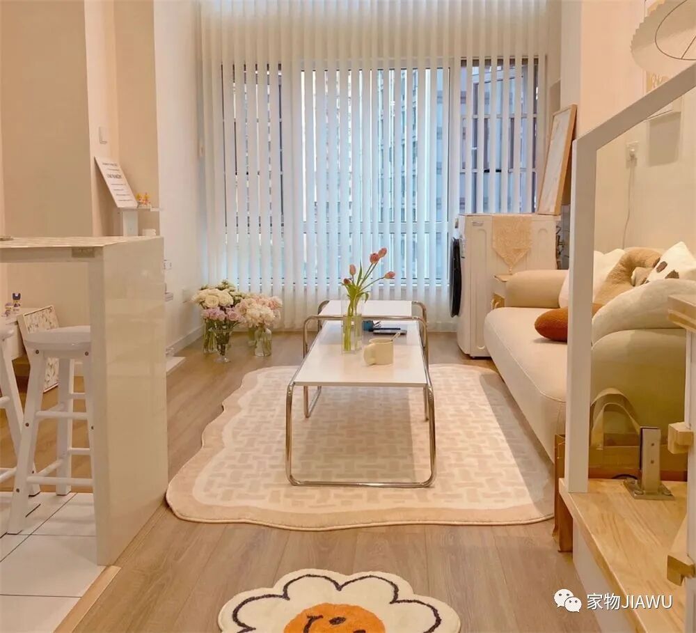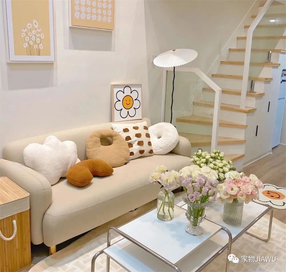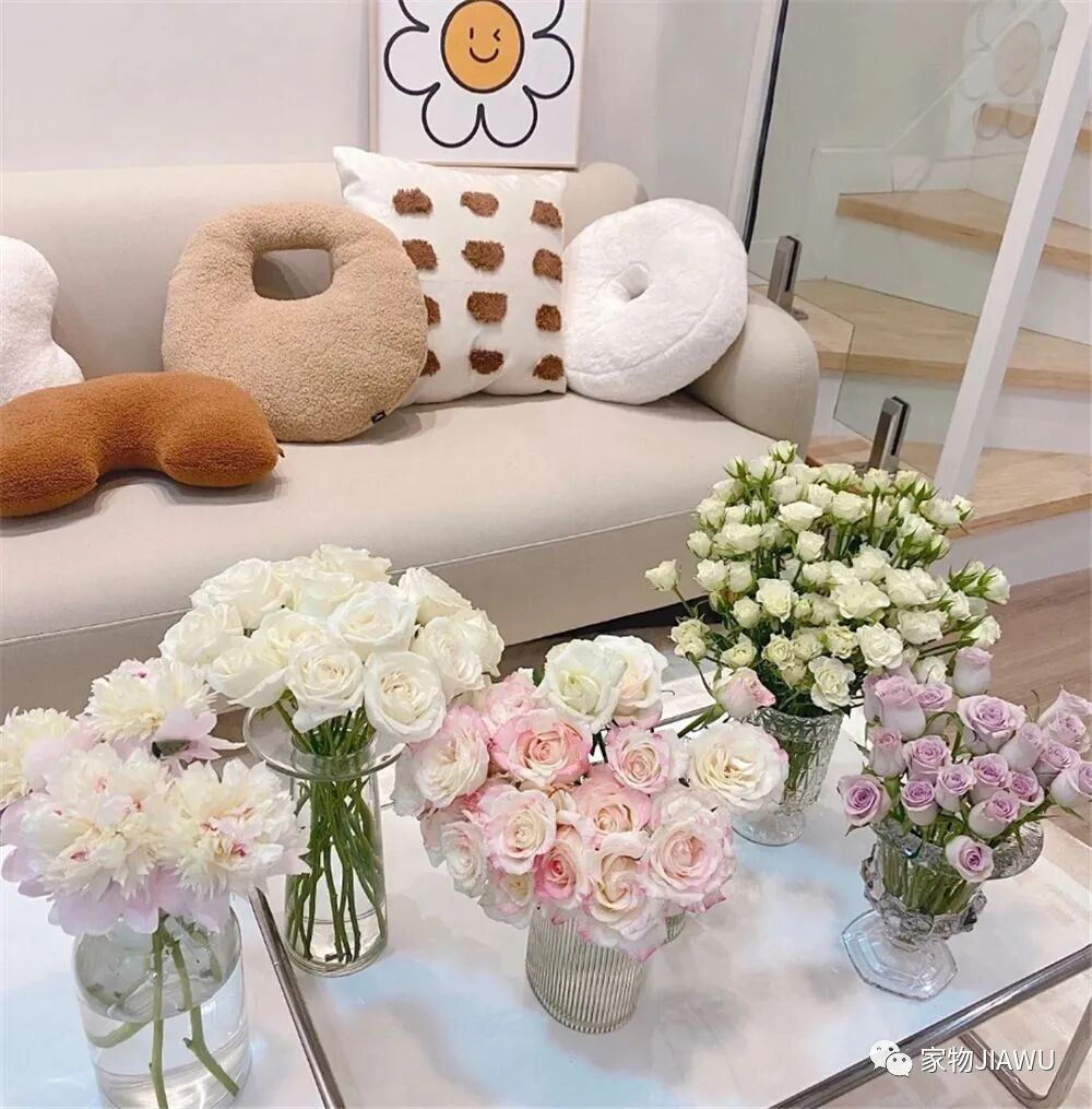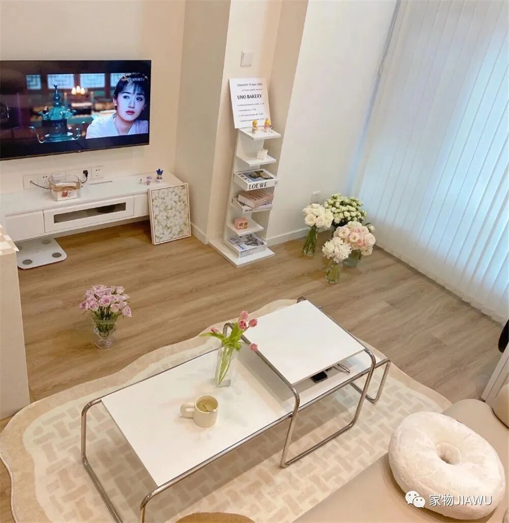 这位姑娘尽可能减少家中的家具和杂物,让客厅保持一种宽敞、明亮的状态,再点缀上些许花卉和布艺装饰,让客厅显得更具少女心。