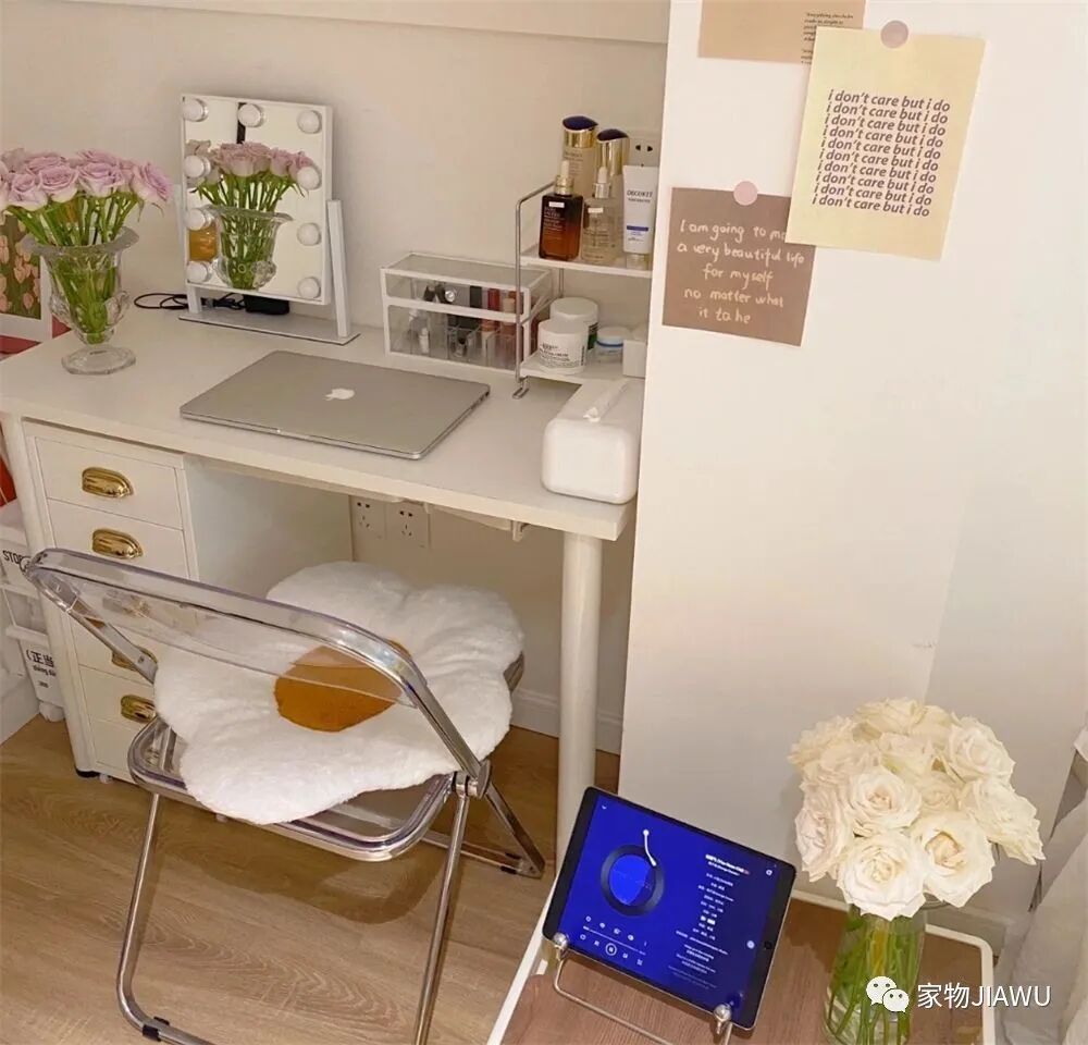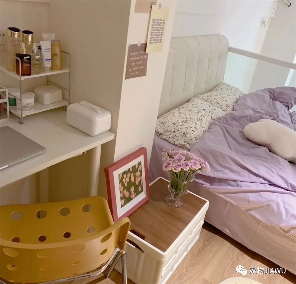 小桌既是这位姑娘的化妆区,又是她的办公区,平日里居家办公,在这样一间小小的LOFT里,想必也是很舒服的吧?~