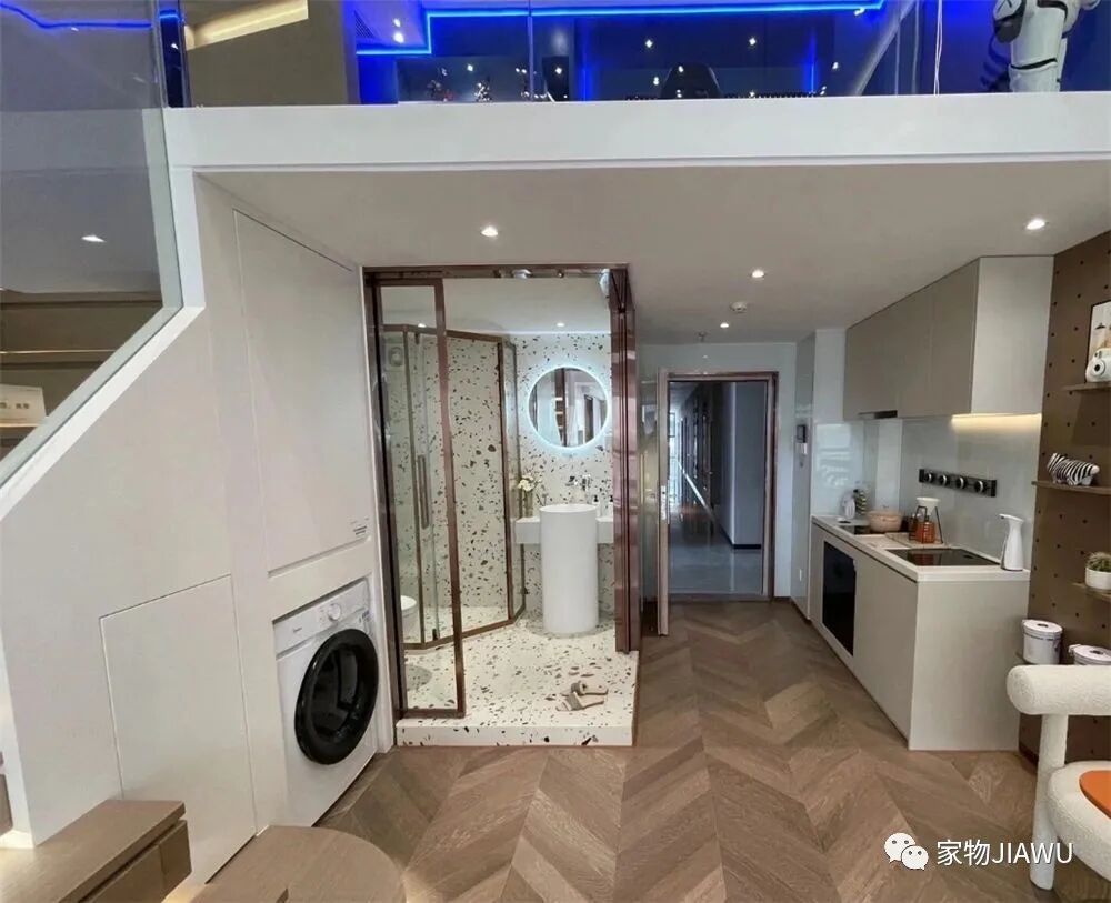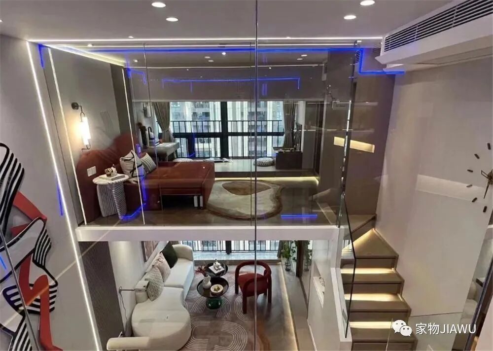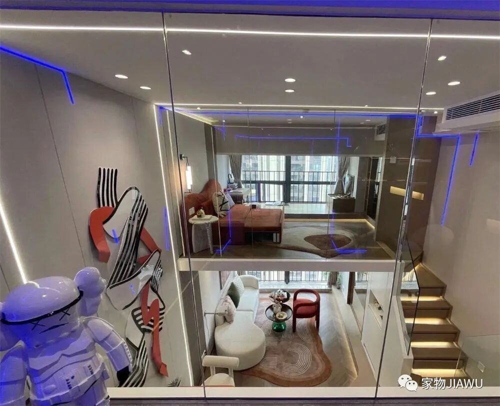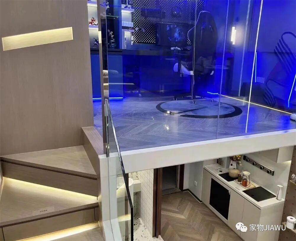 在厨房和卫生间的上面,是家里的隔层书房,这里利用炫酷的灯效和电竞设备,打造成一个小小的电竞室,让这位小哥有地方工作和玩耍娱乐。