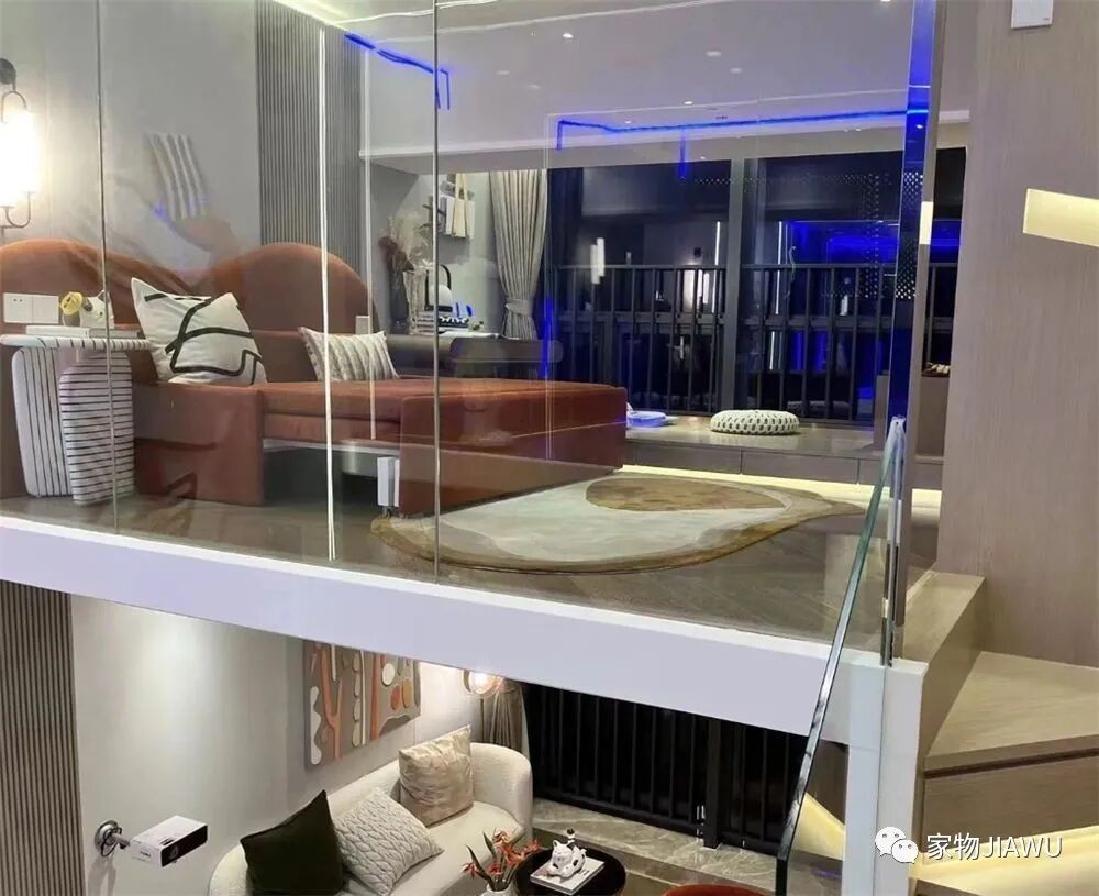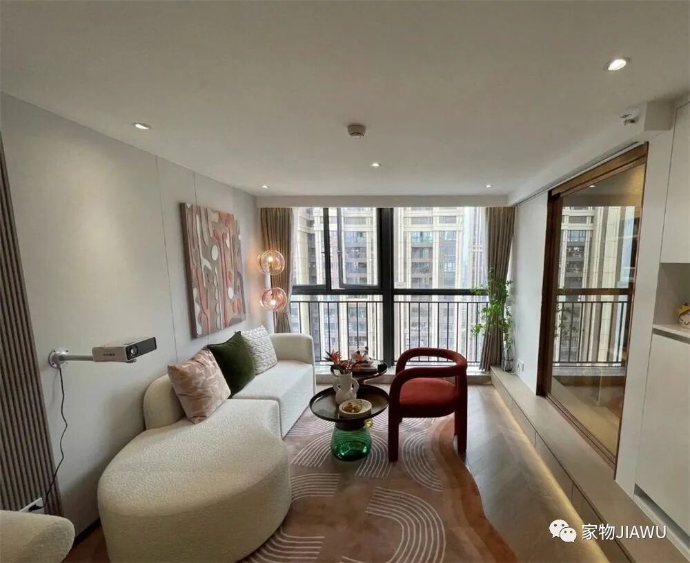 家里的客厅处于隔层下方,一张长沙发搭配小茶几,营造出精致轻奢的氛围感,而电视也被投影仪代替,让家里有个更加舒适放松的观影区。