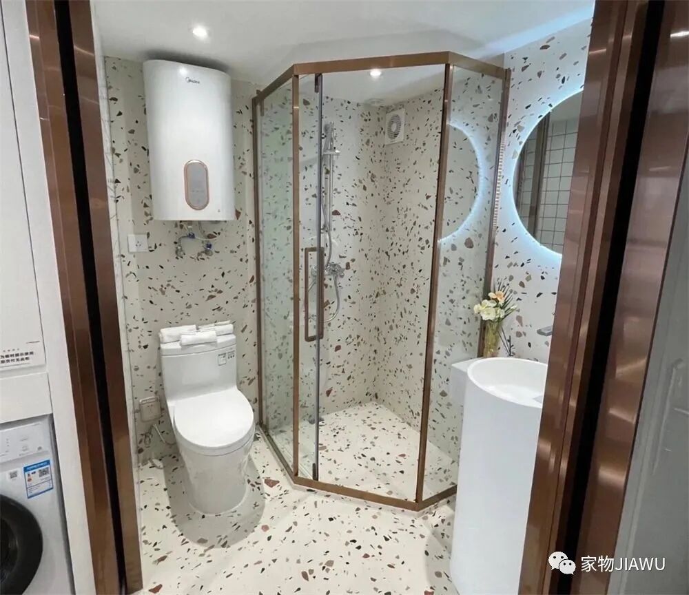 卫生间设计成半开放式的格局,虽然算不上带窗的明卫,但采光和通风都不错,地面和墙面也设计成白色的水磨石纹理,看起来清爽又干净。
