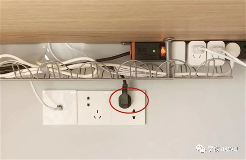 其次是家里书桌下面的插座,如果不用插排的话,高处的显示器插座可以倒着装,而下面的主机插座则可以侧着装,布线更规整、更美观。
