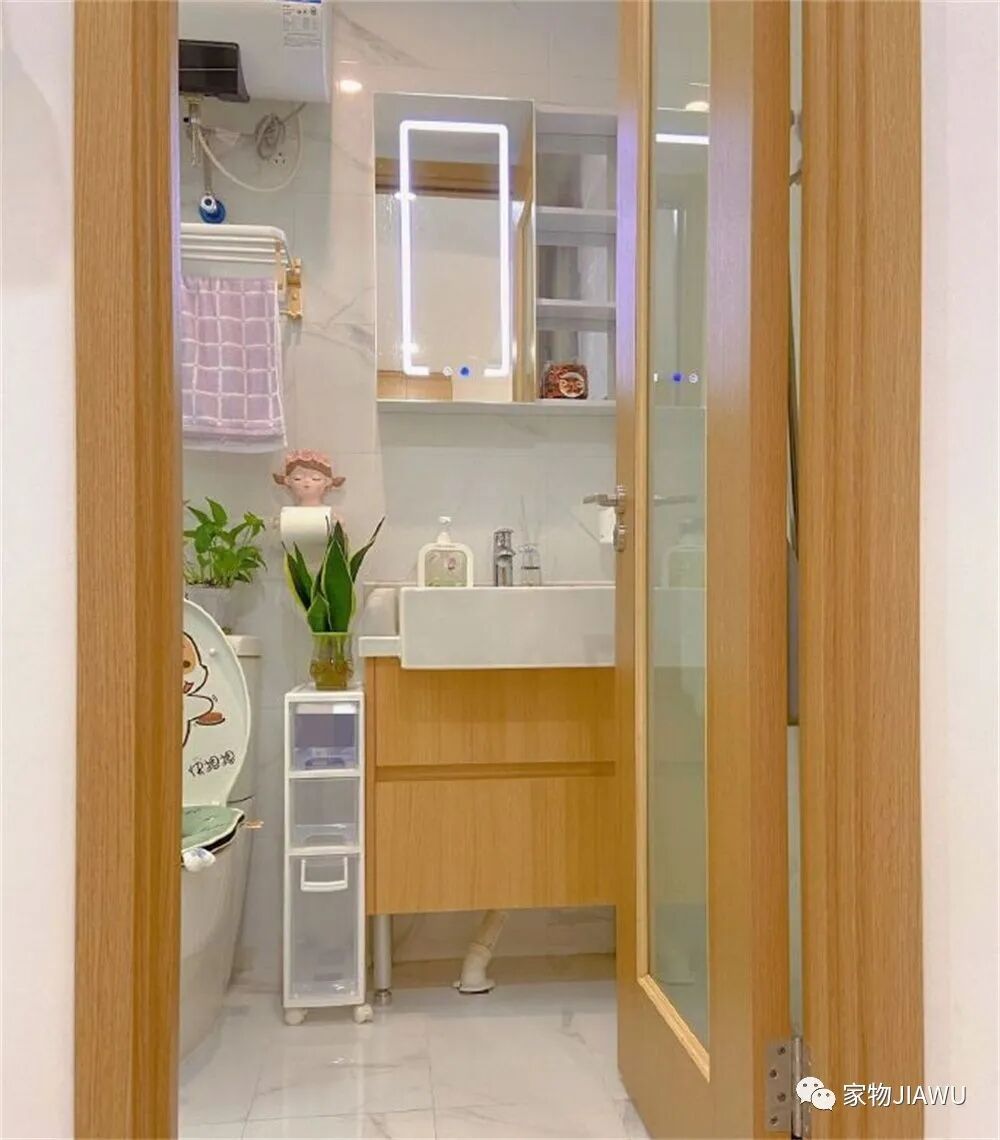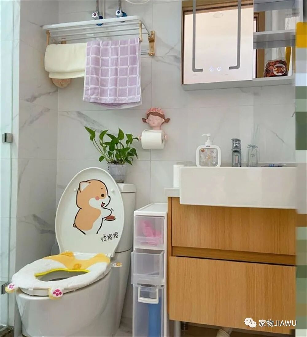 就连马桶周围,也被姑娘用贴纸和马桶垫装饰成了格外可爱的样子,旁边再摆上一个窄柜提升收纳空间,可谓是兼顾美观与实用性。