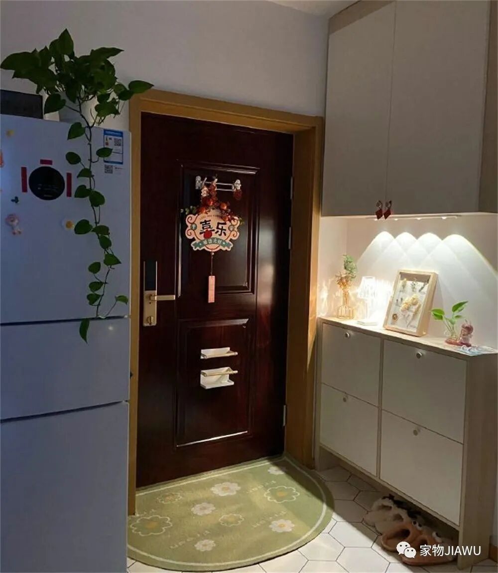 一进门的玄关,就有种拥挤逼仄的感觉,为了能充分利用起纵向空间,这位姑娘将玄关柜做成了通顶式的设计,中间留出开放式柜格,用来收纳各种随身物品。