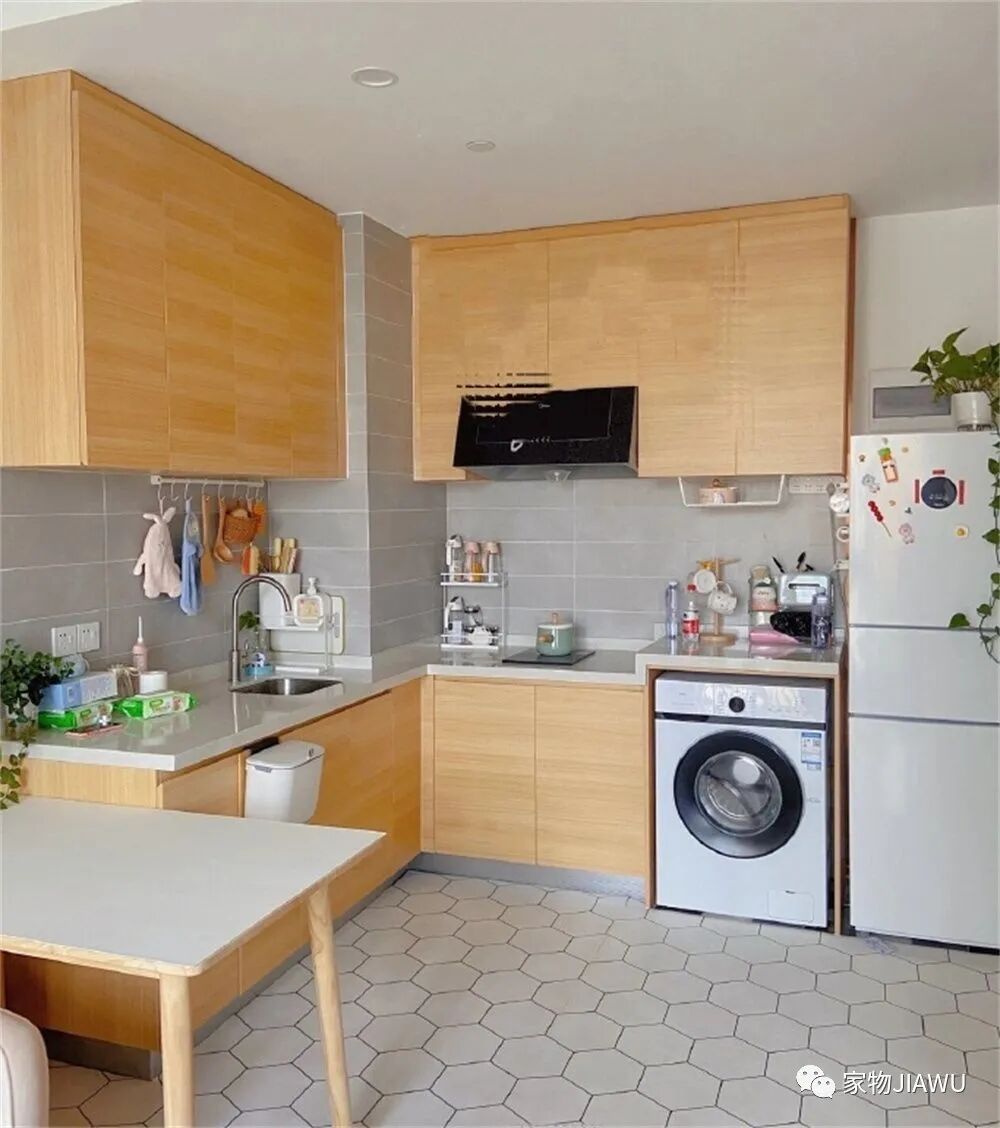 厨房的地砖,也过渡成了这种白色的六边形砖体,比起木地板来说,它更好清洁打理。