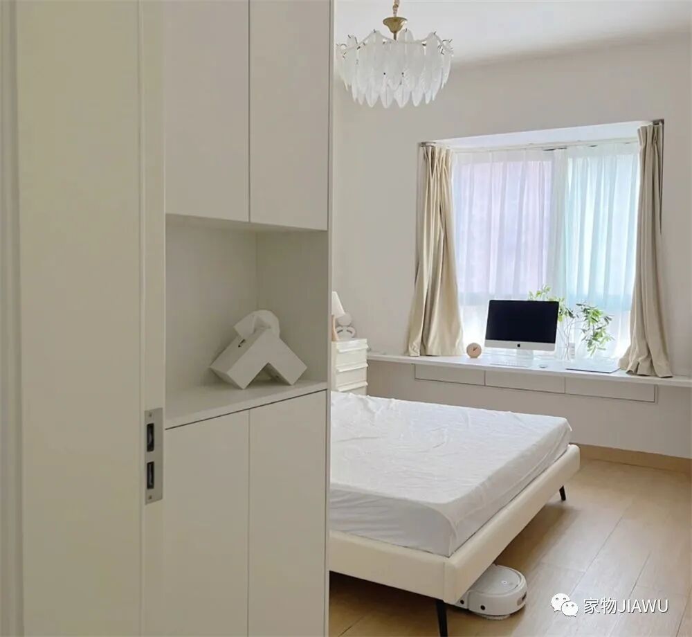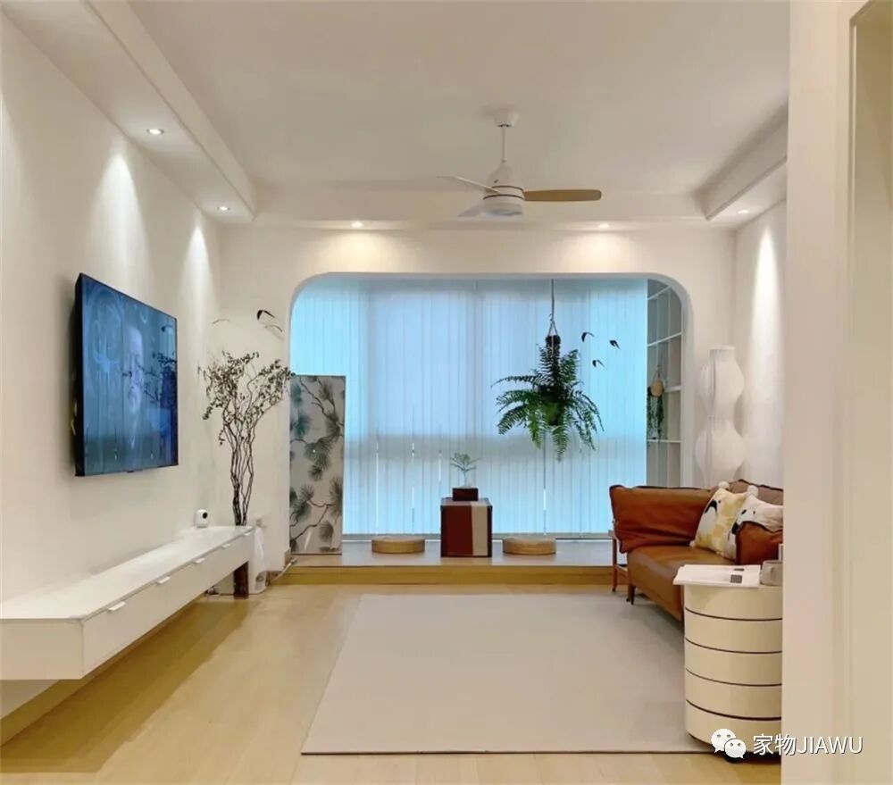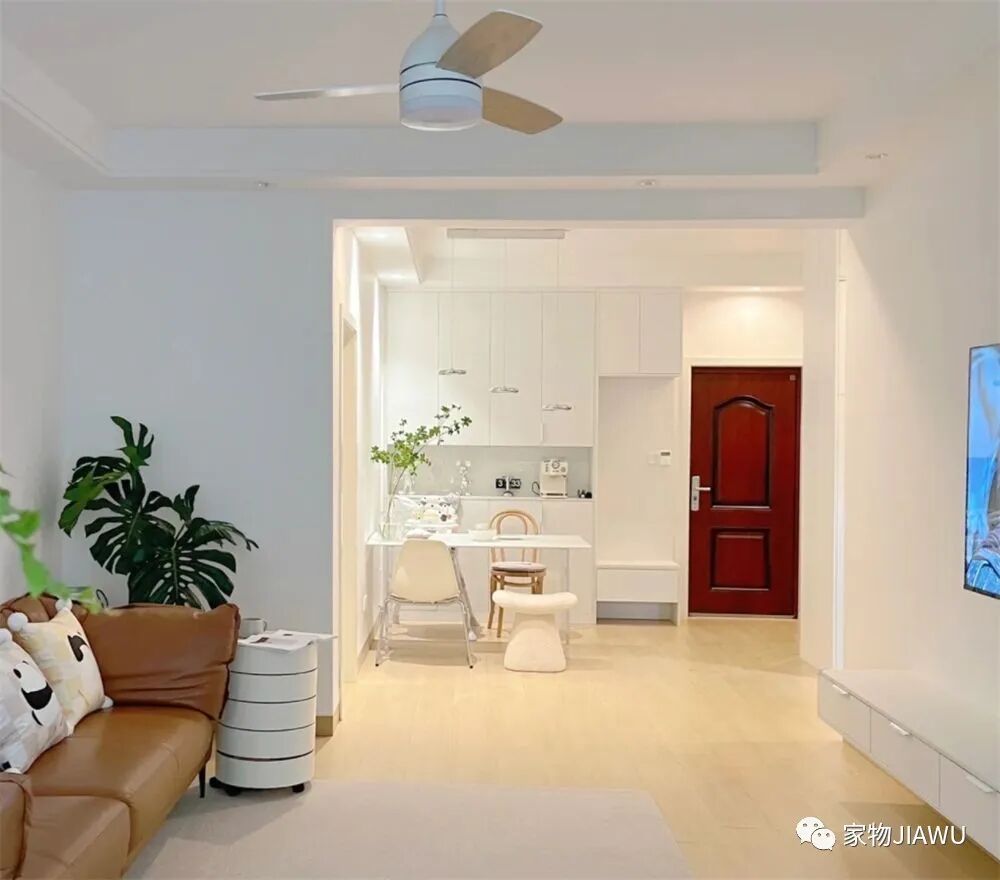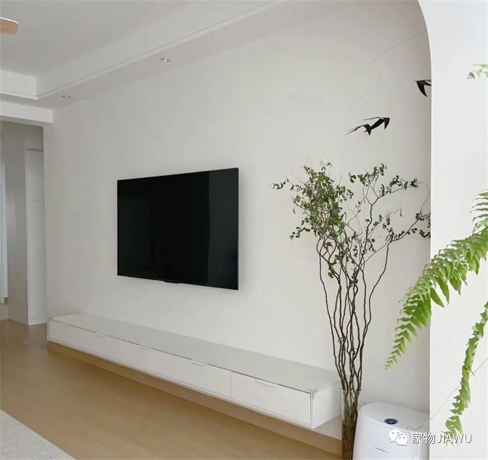 电视墙部分也是极尽简单,大白墙搭配悬空的白色电视柜,再加上一株绿植装饰,让这处空间显得简约又高级,同时也非常耐看,我个人还是很喜欢这种简单装修的。