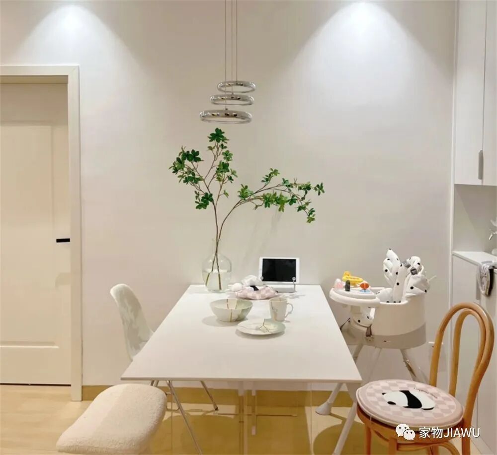 家里的小餐厅布置也很有趣,餐桌后面与玄关柜相融合,打造出一个收纳能力极强的收纳区。