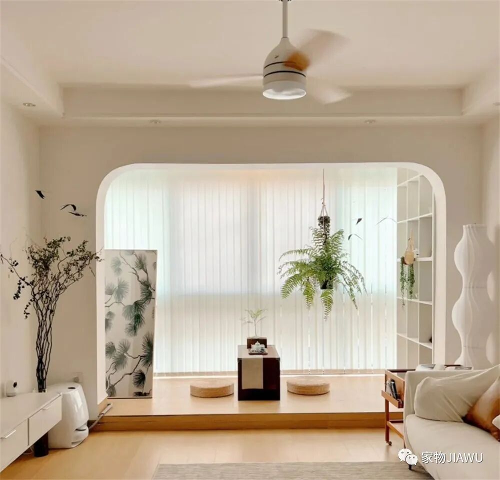 最后,阳台基本上直接和客厅打通,并没有做生活阳台,而是做成休闲阳台,通过地台架高的方式,将阳台变成一个小小的休闲茶室,平日里在这喝喝茶、读读书,还是蛮惬意的。