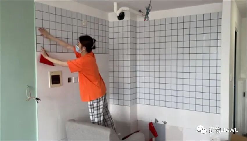 厨房的墙面上贴上了这种方格式的简易贴面,黑线白格的设计看上去清新简约,而且光滑的表面也让厨房墙面更容易清洁。