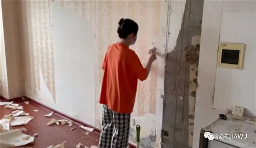 将家里的各种家具清空后,姑娘最先做的就是将这些早就看不顺眼的壁纸统统铲除,而且这一步也非常耽误事儿,姑娘一个人铲了很久,才将这些壁纸基本上清理干净。