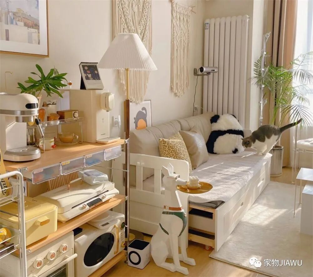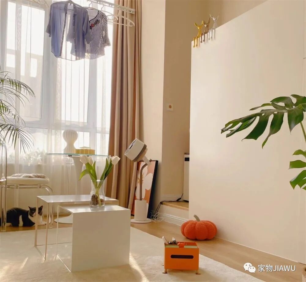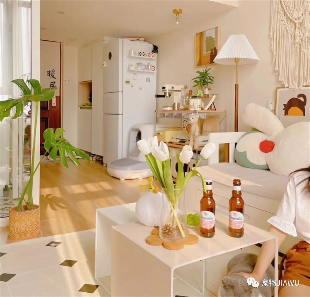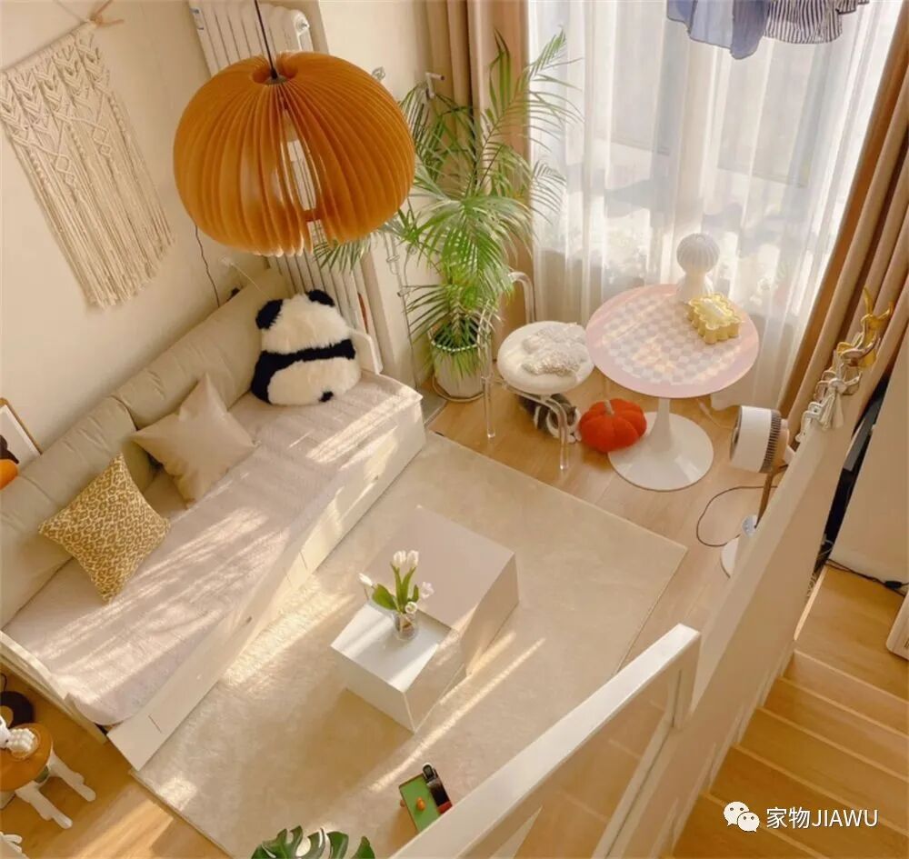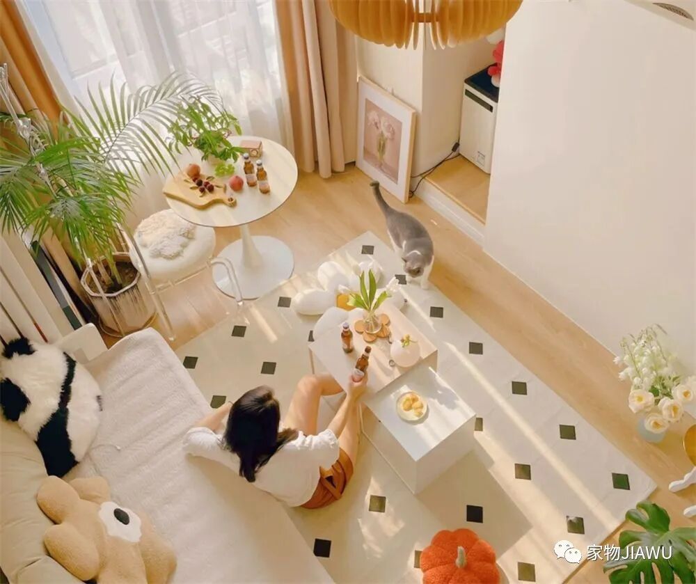 客厅是这个家里相对宽敞的区域,姑娘平日里最喜欢一个人坐在地毯上,晒晒太阳、喝喝下午茶,感受一下生活的惬意。