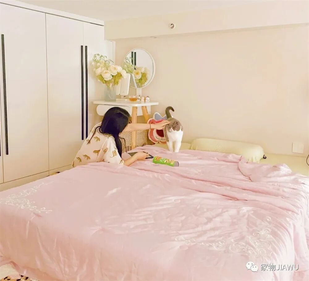 一张尺寸较大的双人床垫摆在这里,既没有降低层高的优势,又给姑娘提供了一个舒适惬意的睡眠区,独居的话还是蛮不错的。
