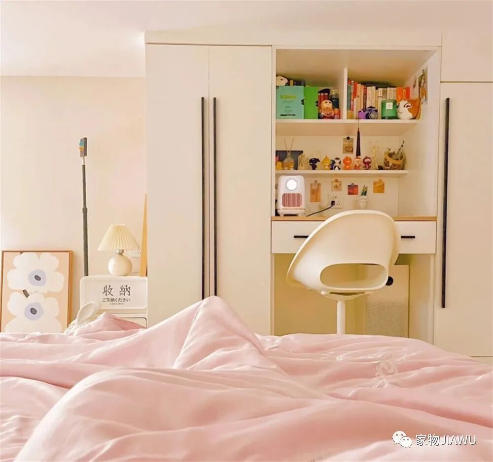 而在床尾,书桌与衣柜相连,既提供了可收纳衣物的衣柜挂衣区,又做出了节省空间的一体式书桌,这种设计确实是美观又实用。