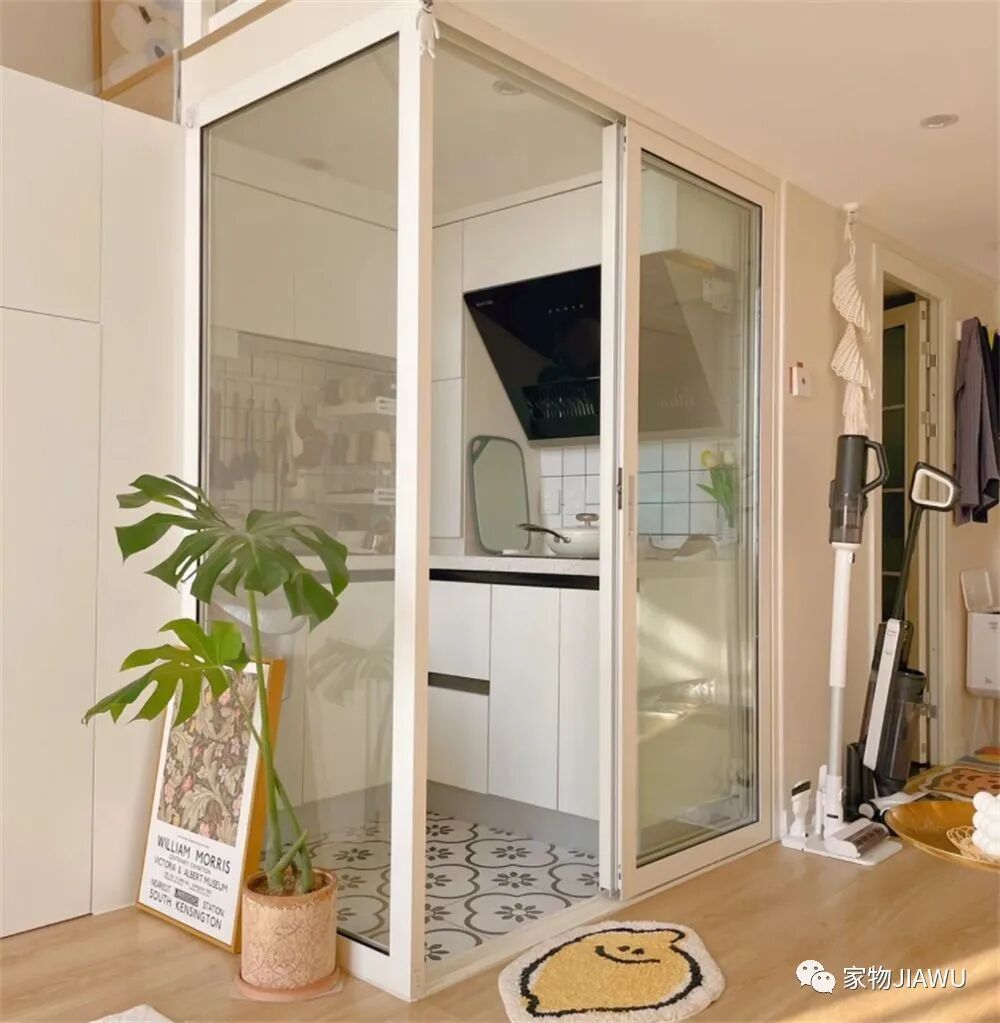 厨房用玻璃推拉门隔断在一个小小的角落空间里,L形的橱柜也打造出了一个使用方便的烹饪区,搭配吊柜进行收纳,让小小的厨房也变得分外干净整洁。