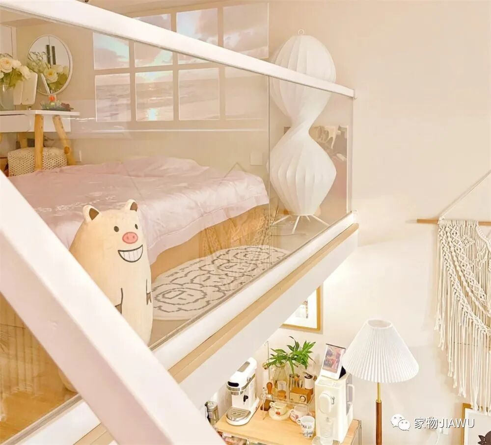 房间内的格局很简单,一层有封闭式的厨房和卫生间和开放式的客厅,二层则是姑娘的小卧室,用玻璃隔断进行阻隔,虽然家里空间不大,但显得十分通透明亮,居住体验还是不错的。