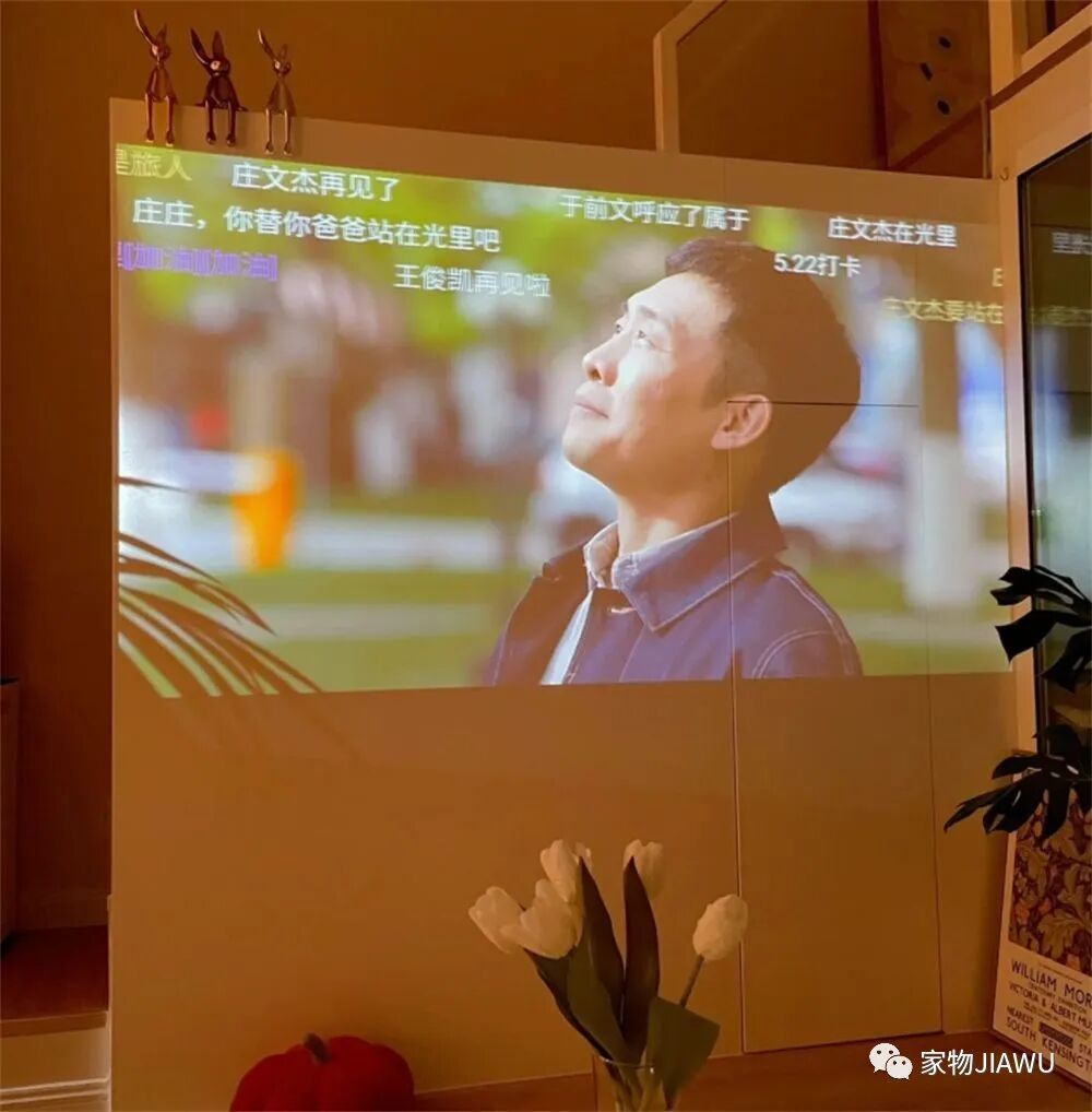 客厅并没有安装电视机,而是用投影仪代替,投射在楼梯边的这面墙上,刚好合适,同时也省去了电视柜和挂置电视的空间。