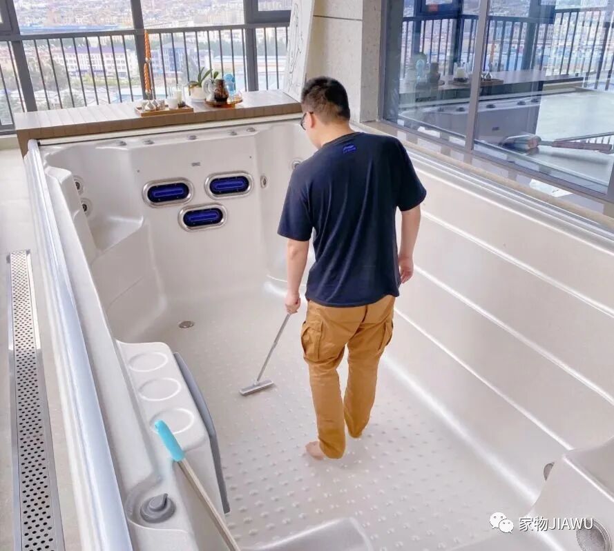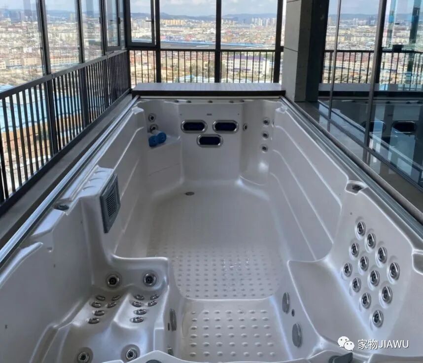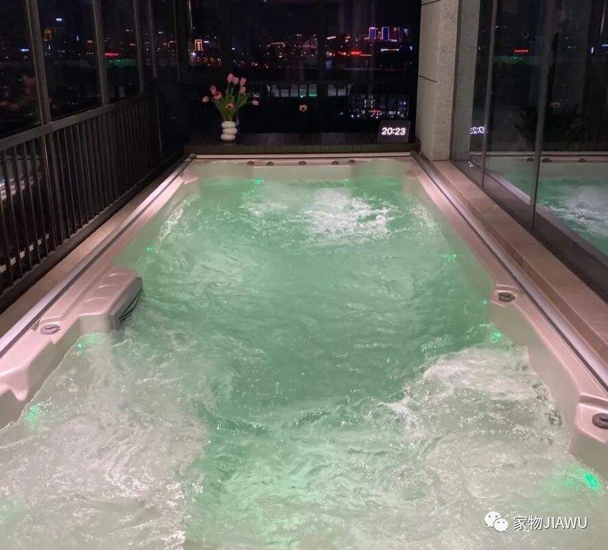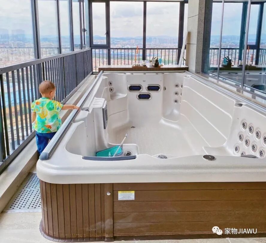 这个嵌入式的泳池,其实本身也是按摩浴缸的一种,通过喷水的阻力,可以实现和跑步机一样的游泳方式,还是蛮有趣的。
