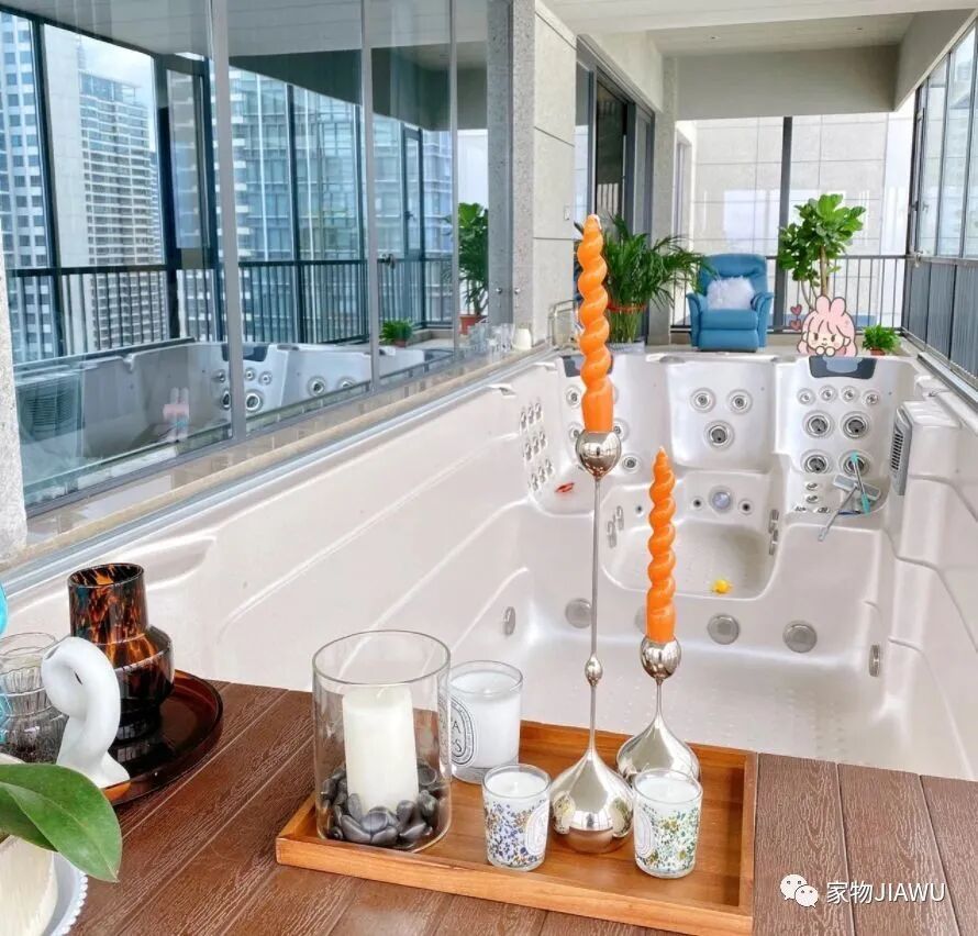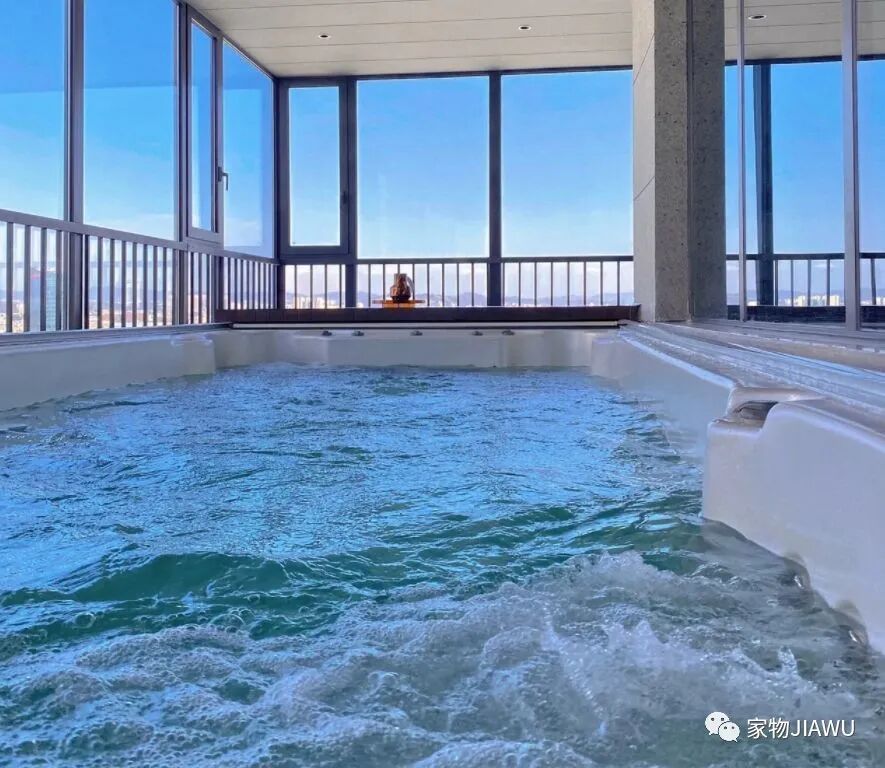 同时,家中的这个泳池放在有着270度视野的阳台上,也能满足观景的需求,想想在高层上能有这么一个泳池,是不是还挺浪漫的?