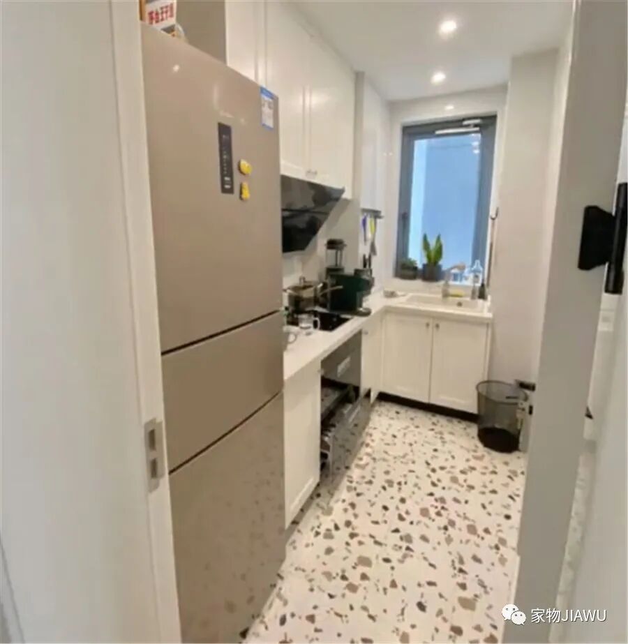 厨房的面积也不大,窄长的格局中设计了L形橱柜,各种厨电厨具一应俱全,搭配水磨石图案地板,同样清新又有质感。