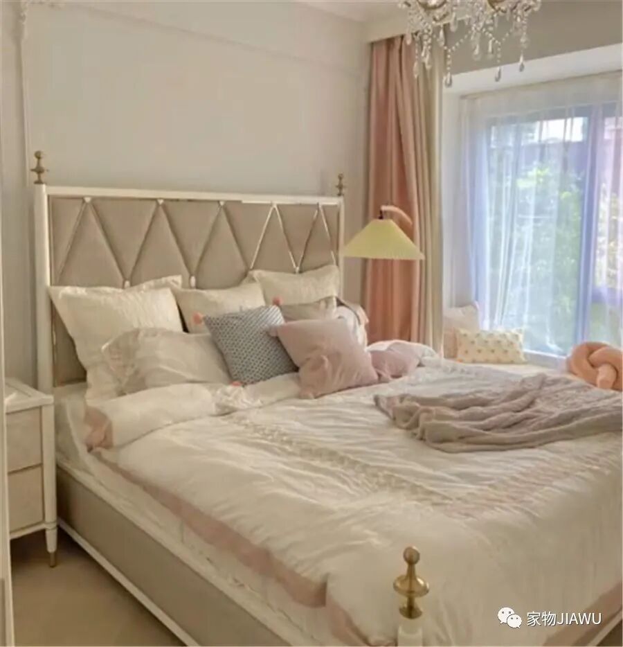 走到卧室内,同样延续了这种灰粉色系的欧式风特点,一张高背大床让人眼前一亮,而飘窗的设计也增添了些许慵懒的感觉。