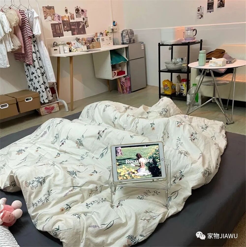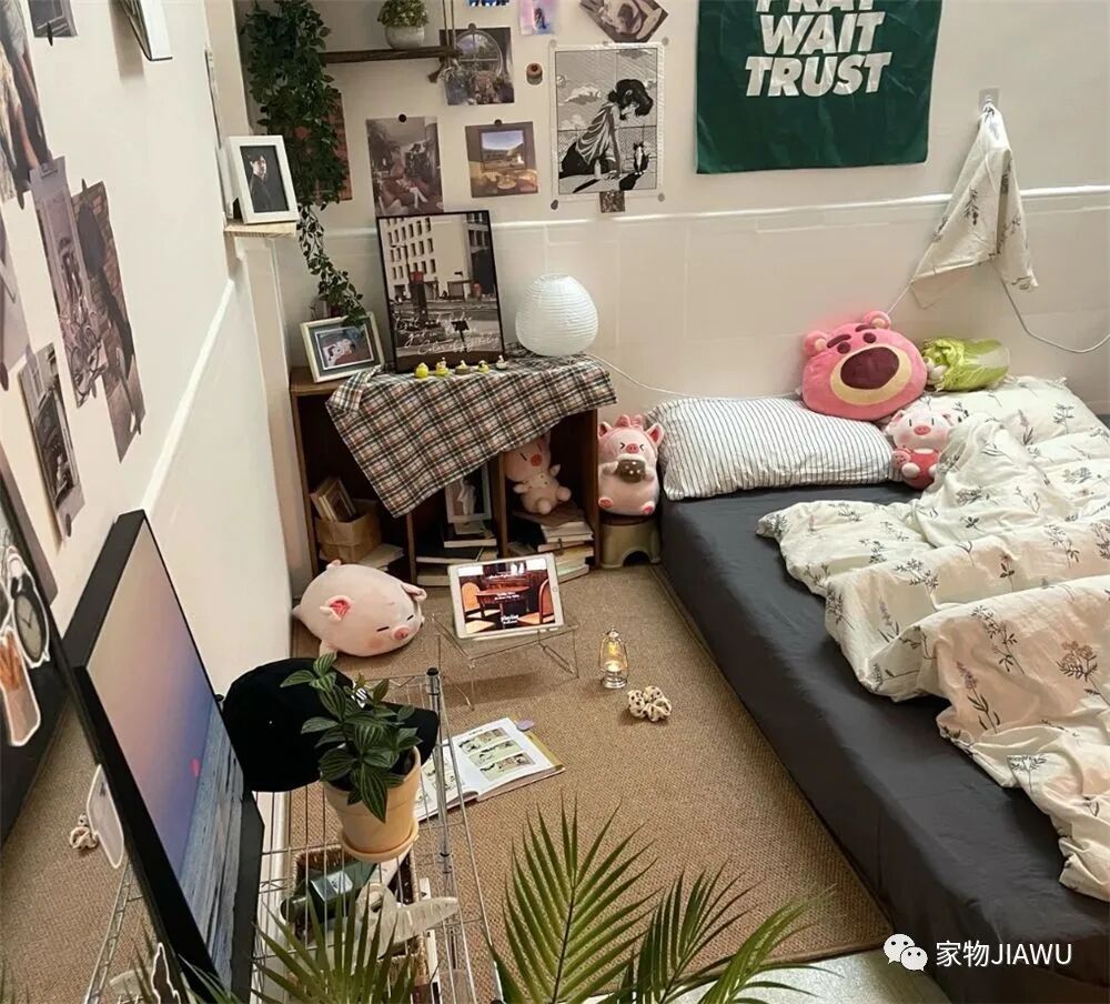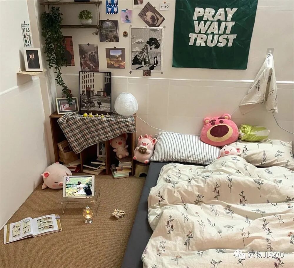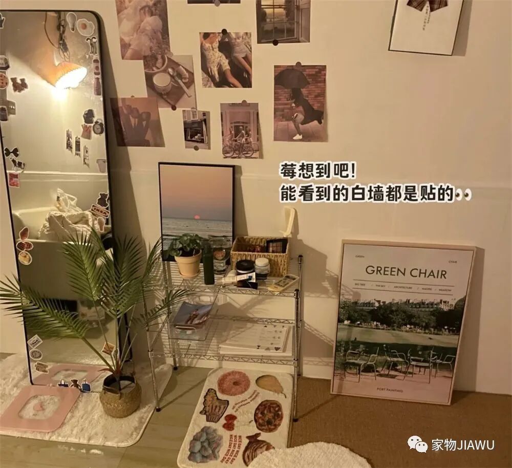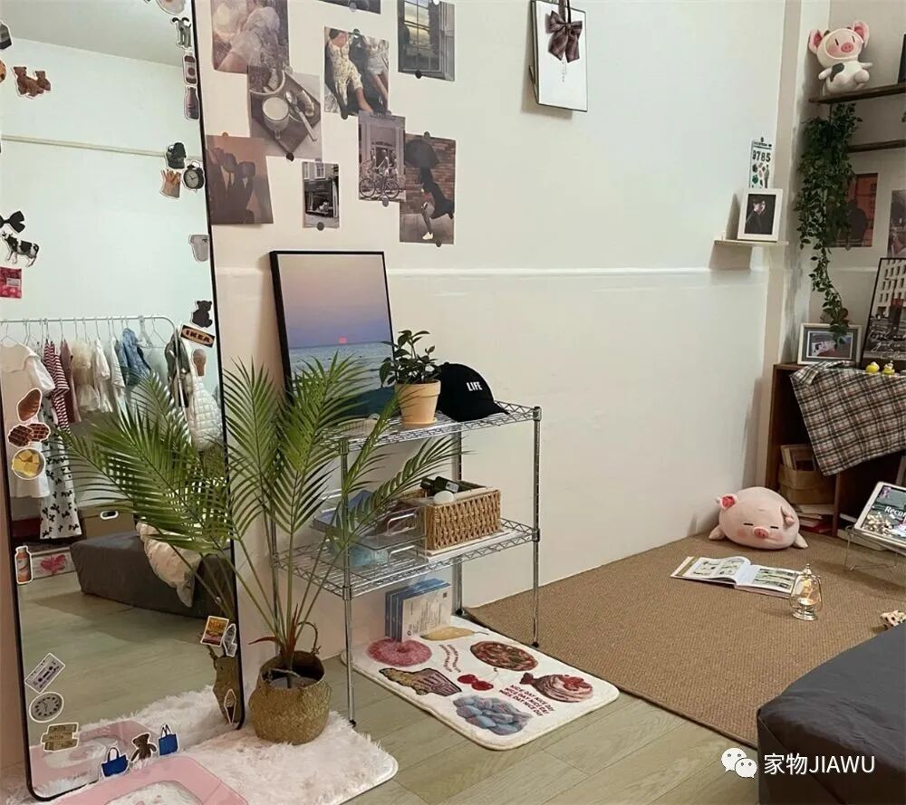 在卧室的床边,这位姑娘也增加了一些别出心裁的装饰,比如一个用来放置收纳盒的小架子,又比如靠墙摆放的换衣镜,看起来颇具INS风的特点。