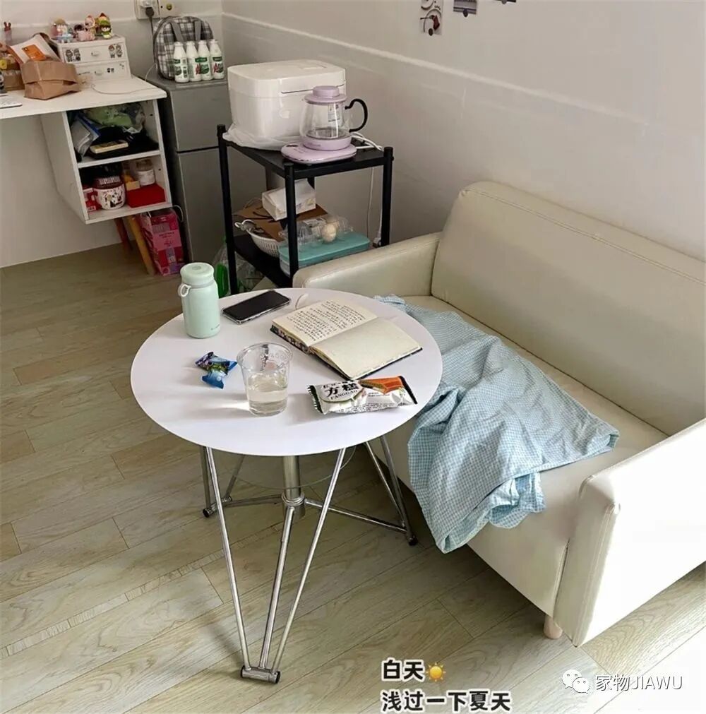 哦对了,在办公桌的旁边,姑娘还买了一张小沙发和一张小圆几,当做一个看书、玩手机的临时休息区,一个人住的她,经常会窝在这张小沙发上,享受属于自己的时间。
