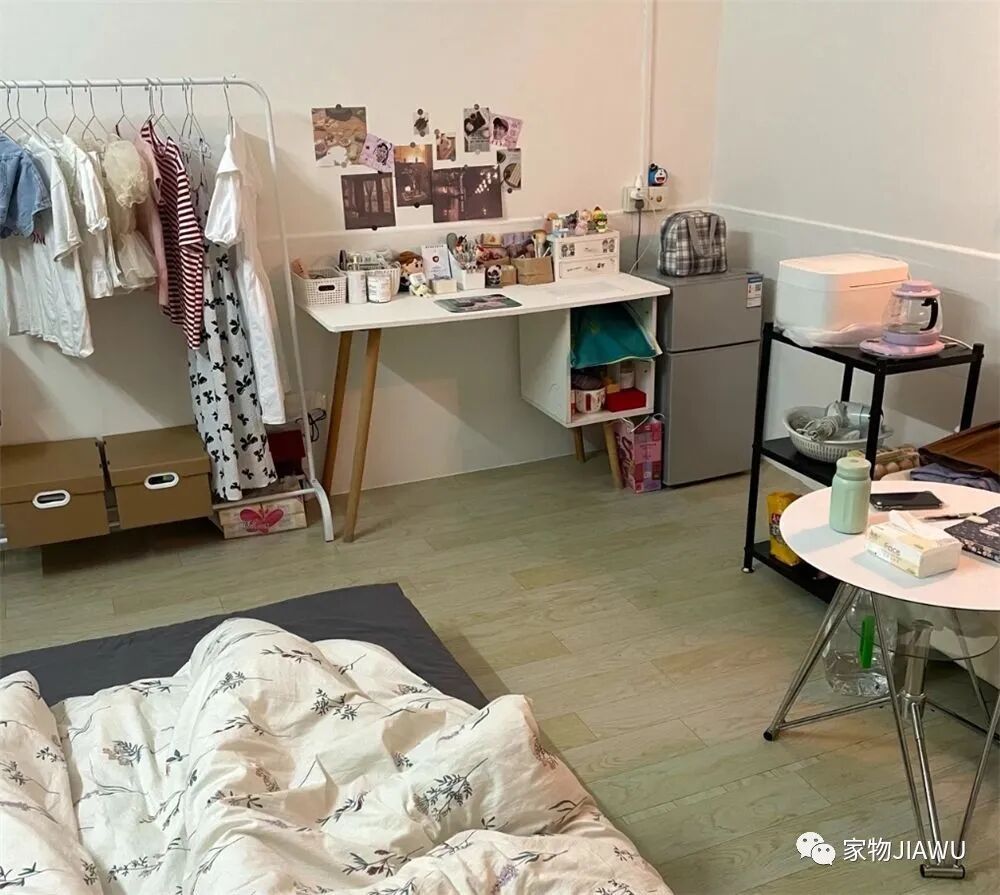 而周围更是放上了小冰箱和这位姑娘的简易衣架,让这处办公区用起来更加顺手。