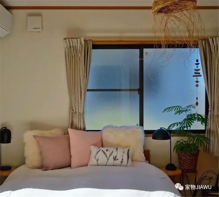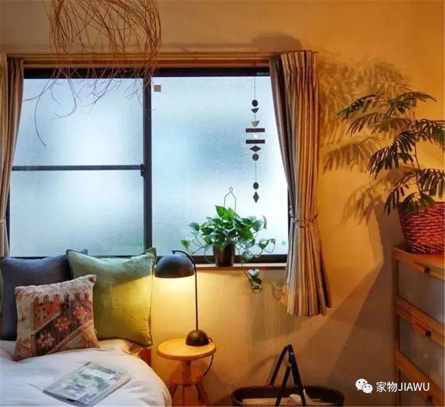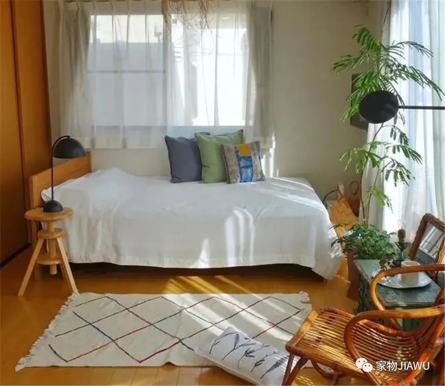 家里有主卧次卧两个空间,主卧中,靠墙的地方也摆放着大株绿植,在阳光的映射下投下斑驳的影子。