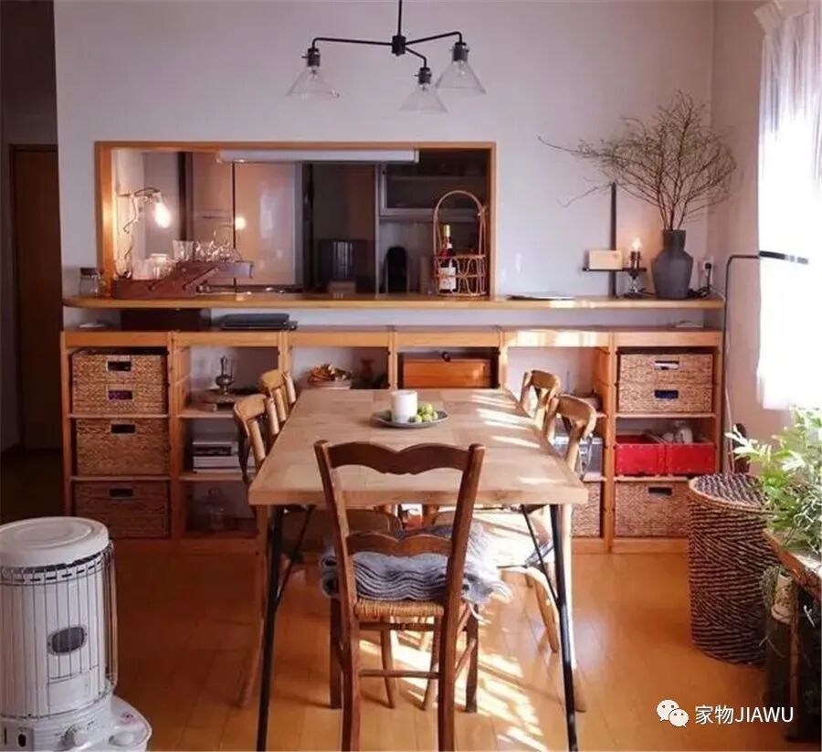 从格局上看,餐厅和厨房之间采用了一种半开放式设计,通过一个窄长的窗口相连接。
