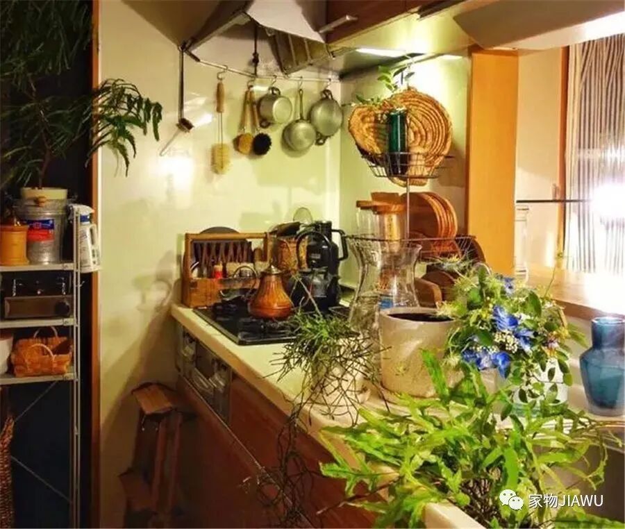 厨房的台面,除了留出日常切菜备菜的空间以外,也同样点缀了绿植装饰,通过窄窗,让客餐厅和厨房形成连贯的装饰。
