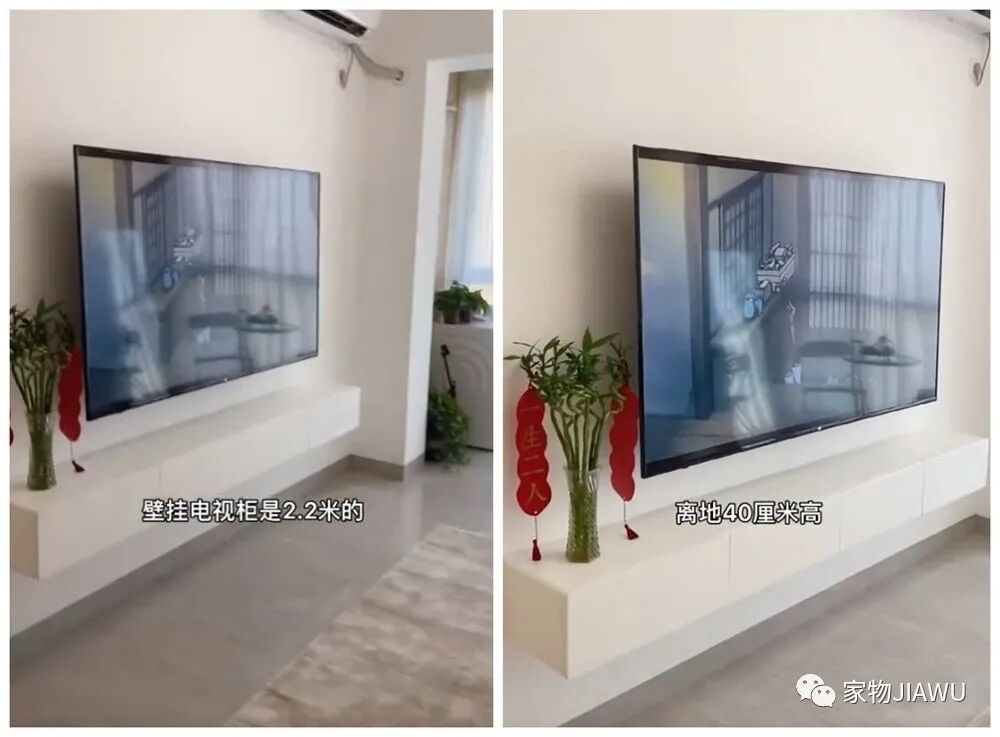 电视墙的电视柜采用了“悬浮”式设计,白色的柜体搭配这种壁挂设计,带给人一种轻盈、灵动的感觉,高级感满满。