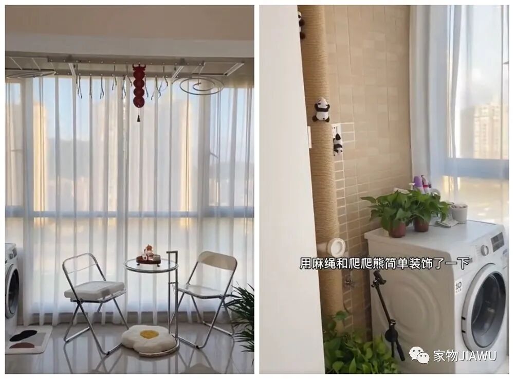 而阳台区域则分位了两个功能区,一边是洗衣晾晒的区域,另一边则摆上了小桌椅,当做休闲的下午茶区域,在这里晒晒太阳、看看书、小憩片刻,别提多惬意了。