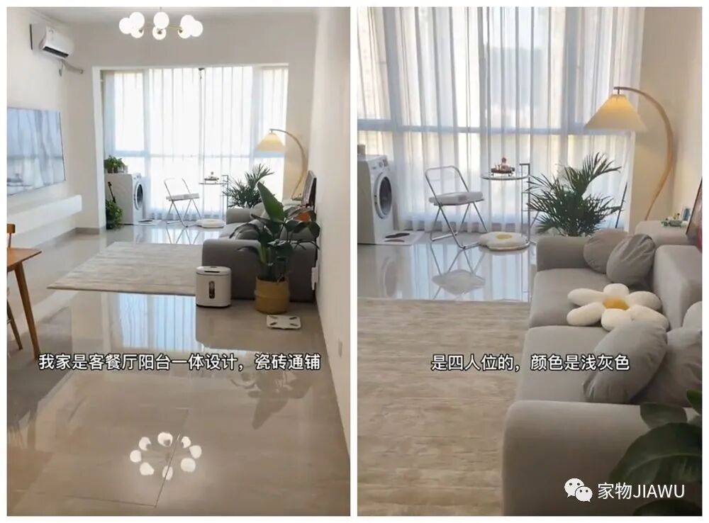 客厅和阳台直接打通,做成一体式的设计,而且瓷砖通铺也减少了清洁死角,打理起来非常的方便。
